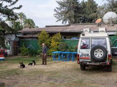 Ein langer Fahr Tag folgt, bis hinter "Dila". Wir finden hier im "Bananen" Gebiet nur sehr schwer einen Nachtplatz. Es ist in dieser Gegend noch schwieriger, da alles bewohnt. Sofort die ganze Ansiedlung - von Dorf kann man nicht reden - ums Auto. Äthiopier kennen keinen Abstand, am liebsten wären sie im Auto. Schön war dann, wir waren erstaunt, der direkte Nachbar kam abends, nachdem alle anderen weg waren und brachte uns Kaffee und geröstete Nüsse. Nachts richtig Regen.