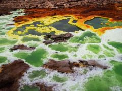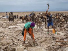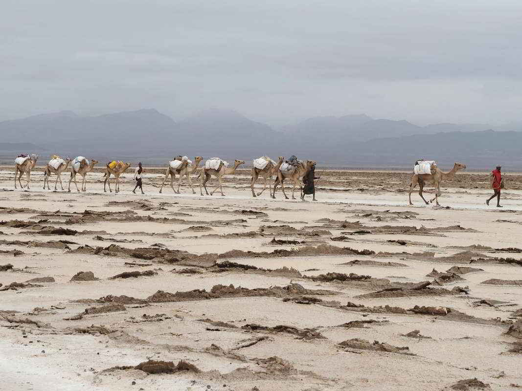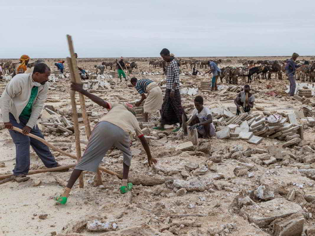 Es folgt ein kleiner Rundgang durch Salzberge und blubbernde Seen. Anschließend sind wir zu den Salzabbau-Arbeitern - den Afar - gefahren und haben diesen bei Ihrer schweren Arbeit zugesehen. Natürlich sahen wir auch die Eselkarawanen, welche das in Platten geformte/geschnittene Salz abtransportieren, wie auch Kamelkarawanen, die das zum Leben notwendige bringen.