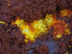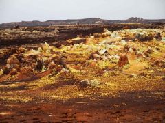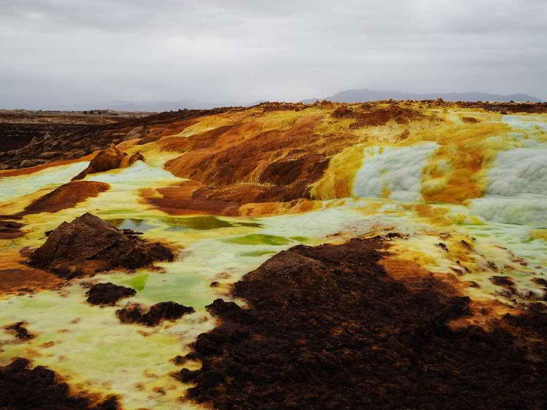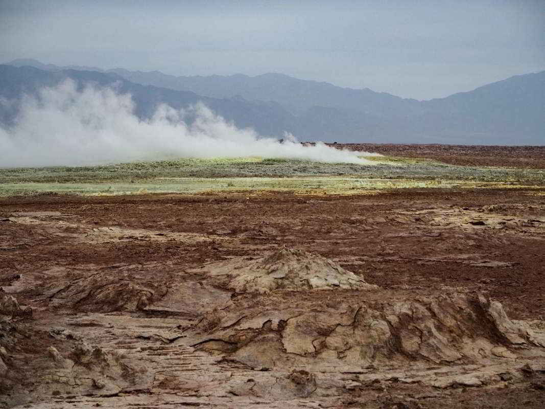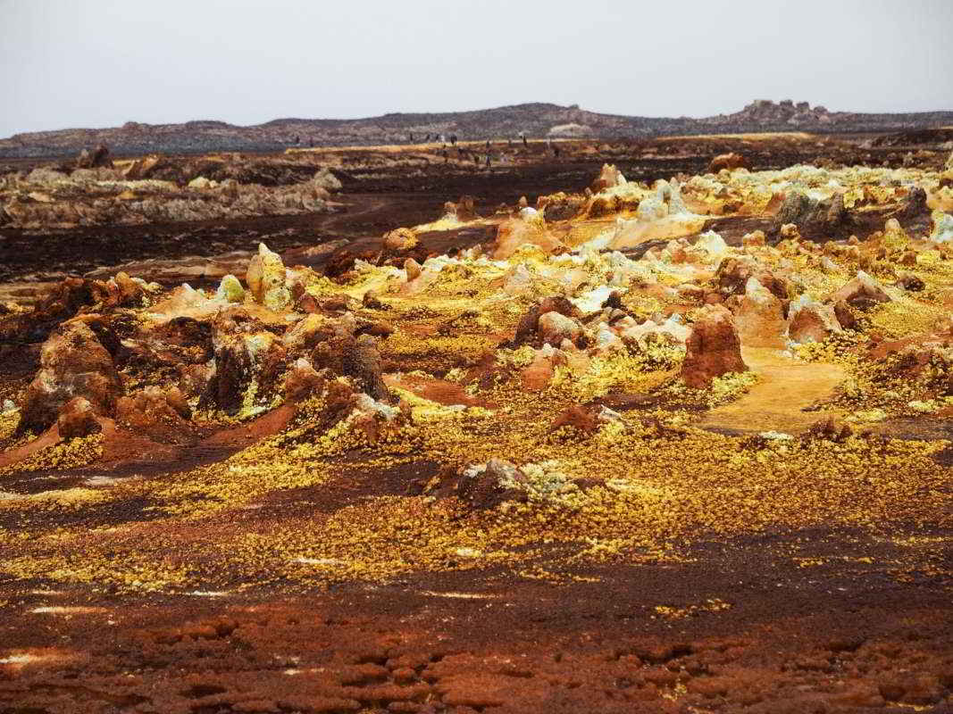 4.30 Uhr aufstehen, leider immer noch kein schönes Wetter, dafür aber nur 28° C. Es geht in das "Dalol"-Gebiet um die farbigen Ausblühungen der verschiedenen Mineralien anzusehen. Es hat schon einen Vorteil als erste Gruppe dort zu sein, wir sind fast alleine. Später wird es richtig voll, man hat permanent Personen in den Bildern. Es ist fantastisch, sich diese Farben in tollen Formen anzusehen.