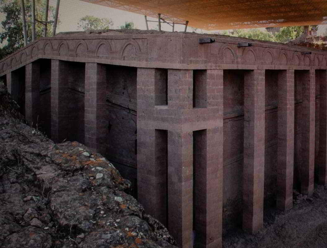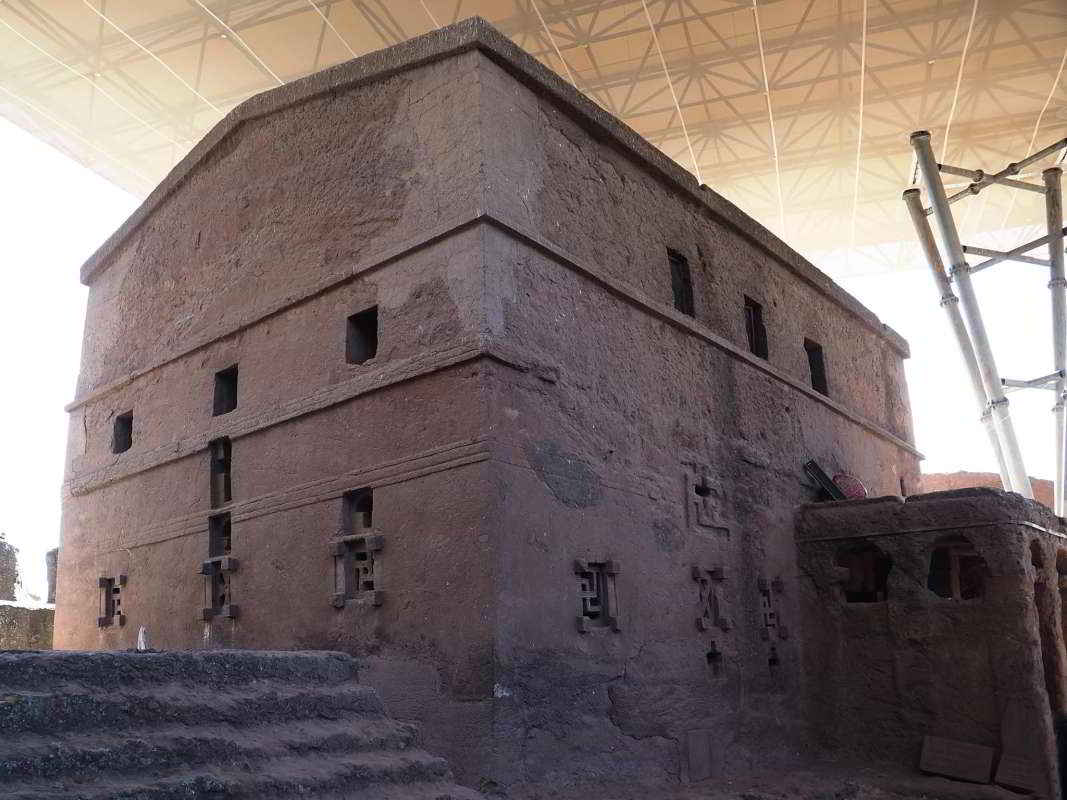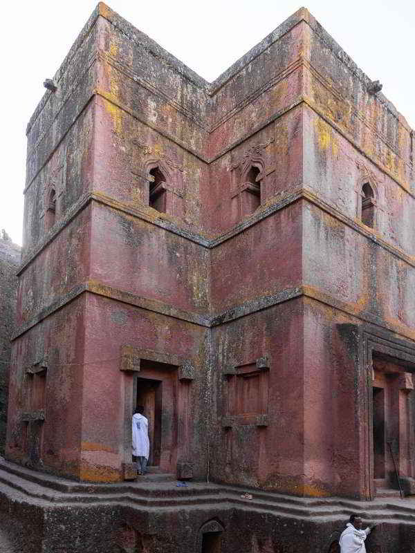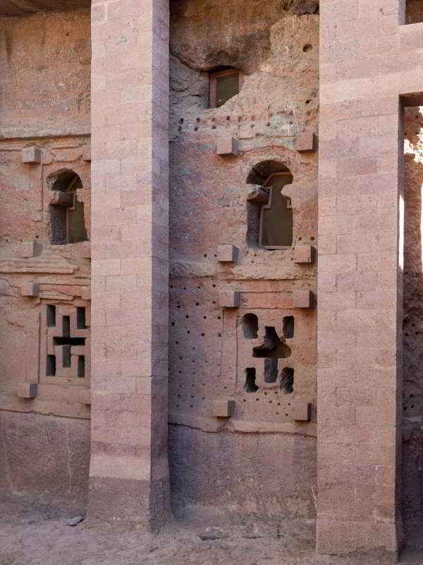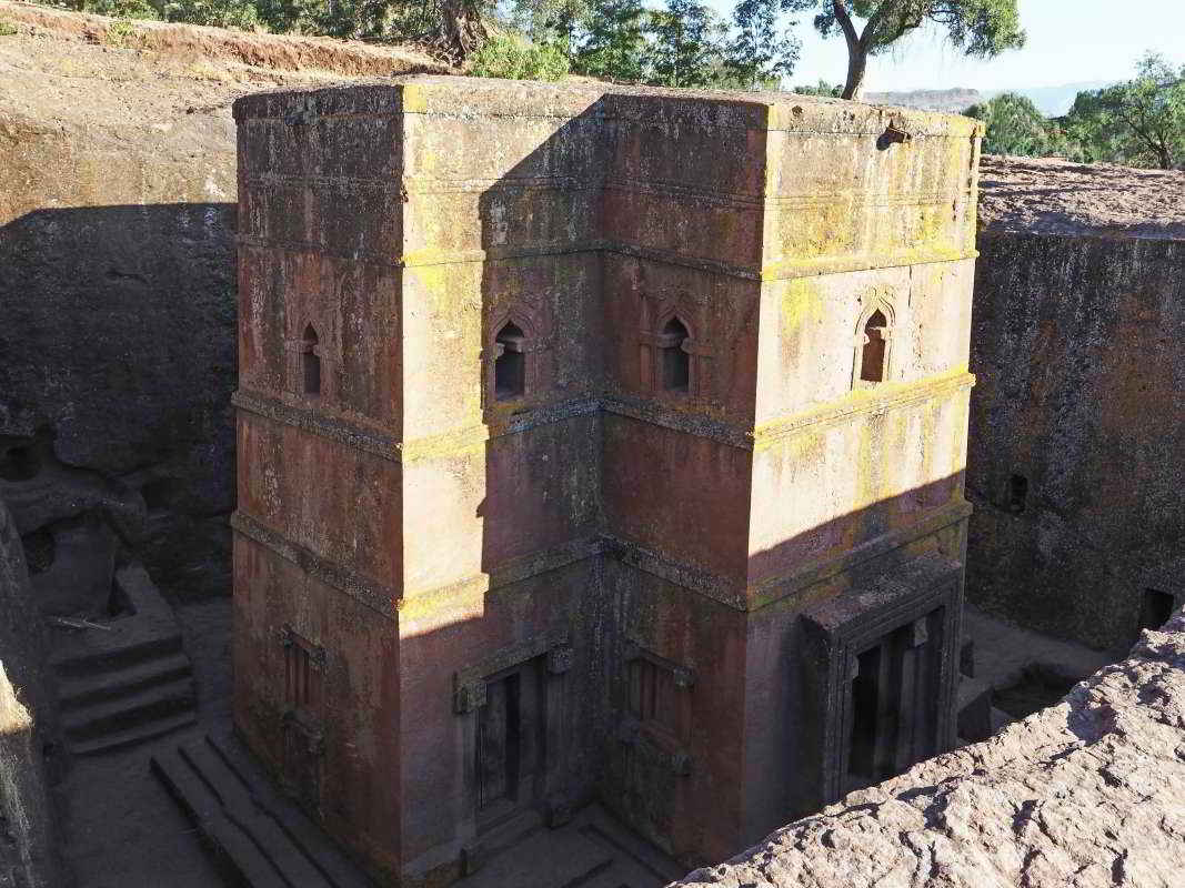 Es ergibt sich ein Rundweg durch die Kirchen durch die Verbindungsgräben zwischen den einzelnen Kirchen. Beginn mit der "Beta Medane Alem", einer der größten monolithischen Kirchen. Die handwerkliche Leistung, diesen 36x27x10 Meter großen freistehenden Steinklotz im Erdboden - in einem Hof, der 45x43x10-15 Meter misst aus dem Stein herauszuhauen und diesen dann auszuhöhlen damit darin eine Kirche entsteht, und das im 12. Jh. mit den damals verfügbaren Geräten, ist kaum zu glauben.