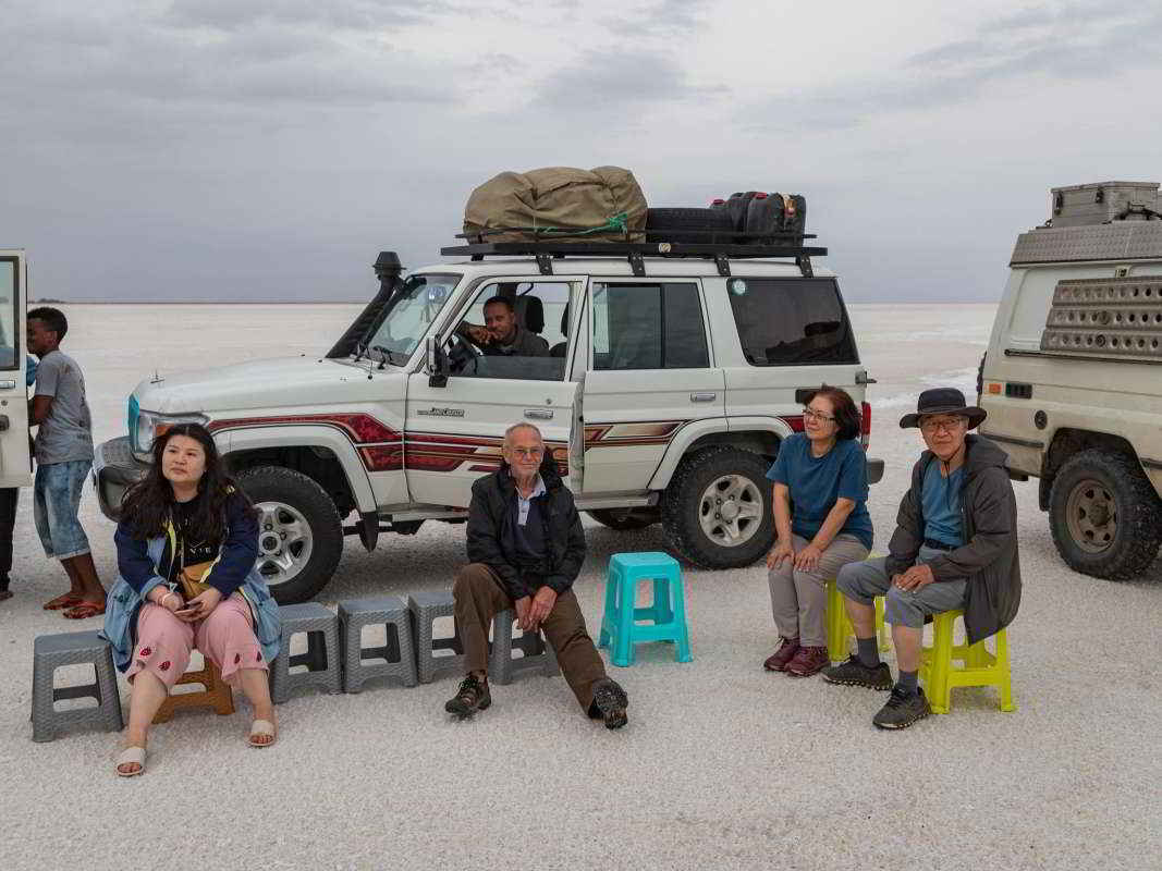 10 Uhr Abfahrt unser 6 Autos in die Danakil. Bei bedecktem Himmel kommen wir nach der Fahrt über "Agula" nach "Asale" welches -125m "hoch" liegt. Dort wird in einer ",Afar"-Siedlung das Nachtlager vorbereitet. Wir fahren derweil zum Badeloch (einige baden tatsächlich) und zum Sundowner.
