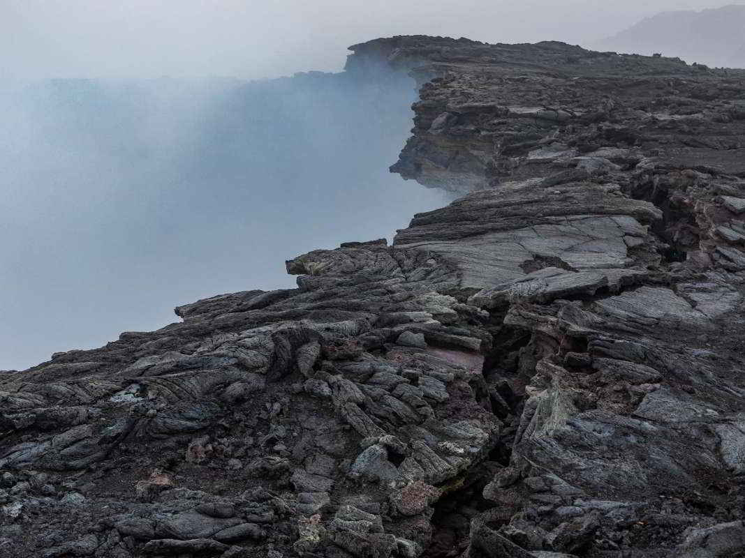 Gegen 20 Uhr geht es los: mit Stirnlampe und Stöcken quälte ich mich die 2,5 Stunden in der Dunkelheit hoch an den Kraterrand durch z. T. völlig wild umherliegende Lavabrocken (es gibt im oberen Bereich keinerlei Weg o.ä.). Dazu kam Nebel und Nieselregen.