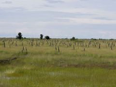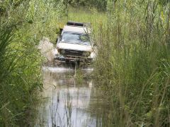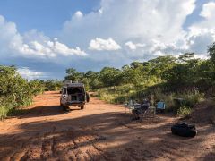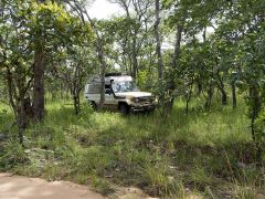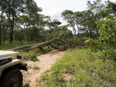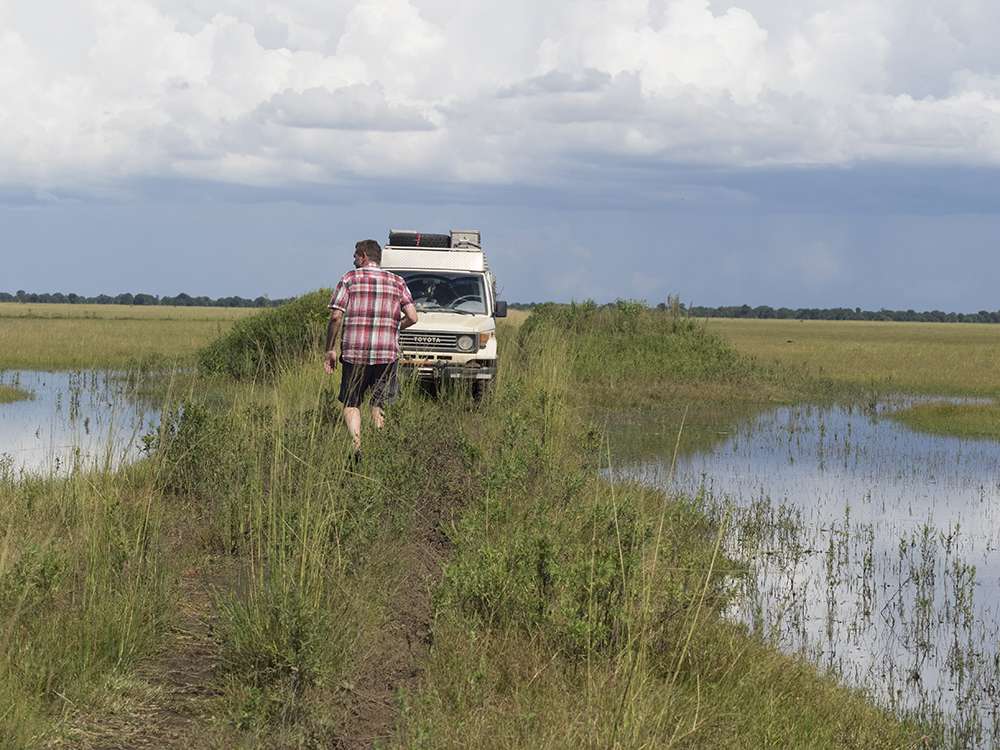 Auf einer schlechten Piste reicht es uns heute bis zum „Waka Waka“ See. Es ist hier wohl sehr wenig Fahrzeug Verkehr, umgestürzte Bäume müssen durchs Gelände umfahren werden, z.T. Ist die Piste mit Gras zugewachsen. Wer fährt auch schon zu dieser Jahreszeit in die Sümpfe. Seltsame Tiere fahren mit.