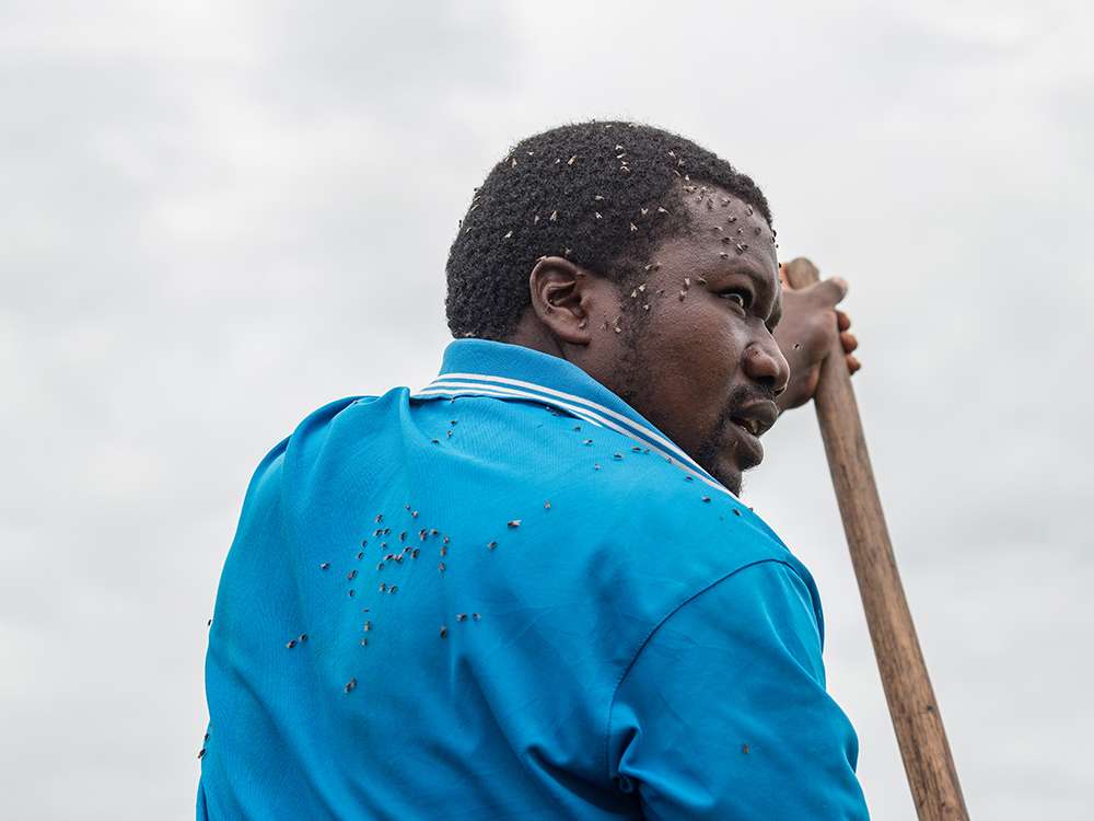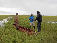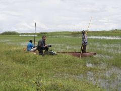 Morgens fängt es an zu regnen. Ich denke an die glitschige Rückfahrt auf dem Damm. Aber die Schuhschnäbel rufen. Tatsächlich erscheinen zwei Mann im Einbaum gegen 8 Uhr bei strömendem Regen, um uns abzuholen.