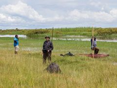 Ein Angestellter aus Chikuni hat uns bereits entdeckt, er erlaubt uns hier zu übernachten. Olaf watet dann mit ihm die ca. 1km von uns bis zum Camp durch den Sumpf. Zurück kommen die Beiden dann mit einem Quad, es ist alles für morgen geregelt. Wir werden mit dem Kanu abgeholt.