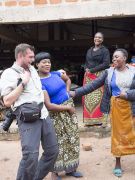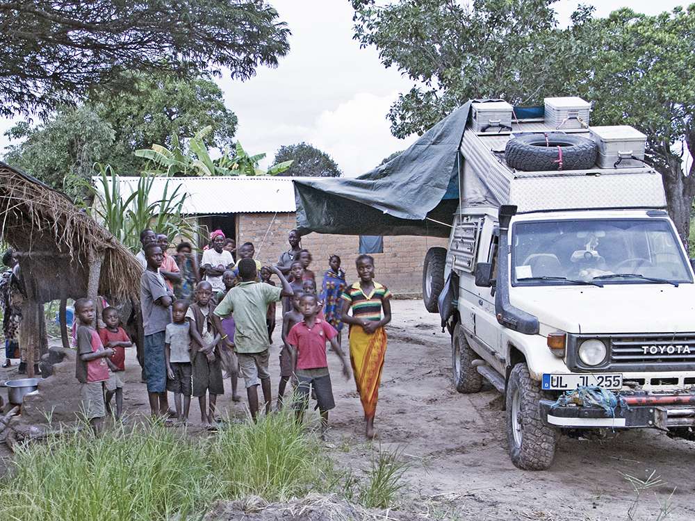 Am Abend verlassen wir den Damm, meine morgendlichen Bedenken werden fast wahr, das Auto steht plötzlich quer, und ein Rad in der Luft, aber Olaf meistert diese diffizile Situation. Übernachtung auf dem Grundstück eines Privatmannes in „Muwele“ - riesiger Circus, die vermutlich gesamte Kinderschar aus dem Dorf ist anwesend, einschließlich seinen eigenen 13 Kindern.