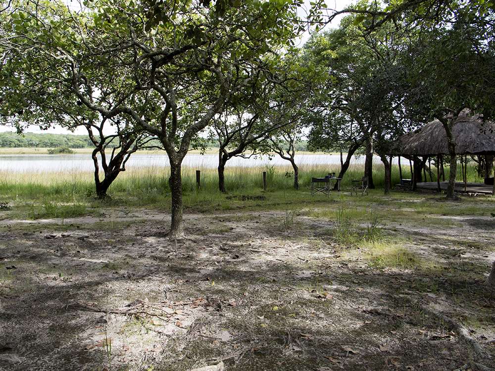 In „Mbala“ am „Chila See“ gibt es ein Camp mit Häuschen, aber keine direkten Plätze für Camper-Autos oder Zelte. Wir können uns auf einen befestigten Weg stellen. Ein Vor- bzw. Nachteil ist, dass der Platz von drei freilaufenden scharfen Hunden bewacht wird, die bei jeder Bewegung reagieren.