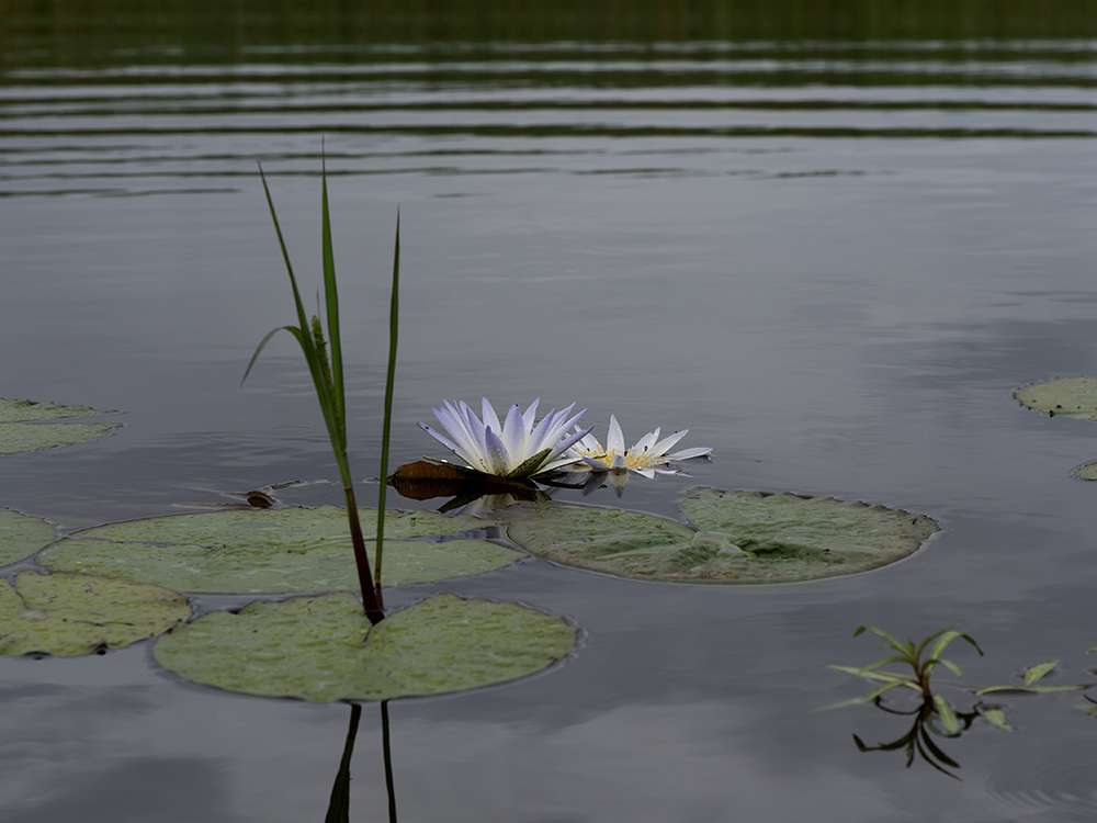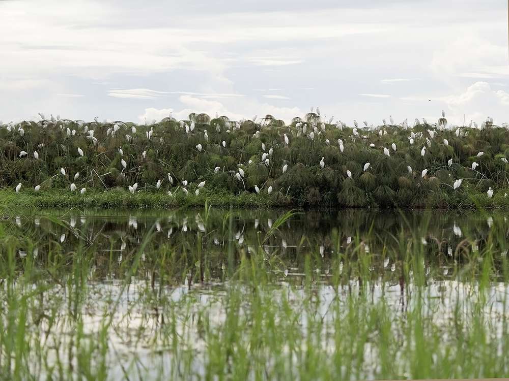 Es ist zuerst ein seltsames Gefühl ca. 10 cm über der Wasseroberfläche von rechts nach links und umgekehrt schaukelnd dahin zu gleiten. Wir sehen viele Reiher auf den Papyrusstauden sitzen, Enten und sonstige Wasservögel begleiten uns. Immer wieder geht es durch hohes Schilfgras mit Seerosen in verschiedenen Farben. Es gibt neben den exotischen Tieren aber auch viele Fliegen.