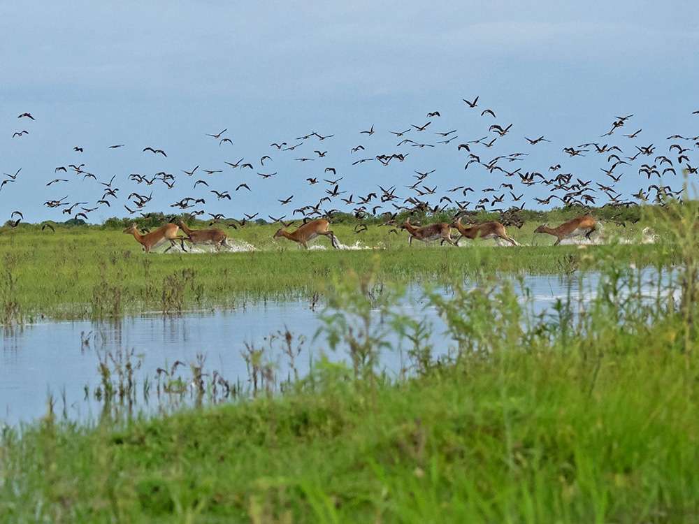 Viele „Bangweulu Moorantilopen“ die nur hier in diesen Sümpfen vorkommen und viele,viele Vögel begleiten uns.