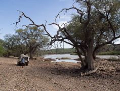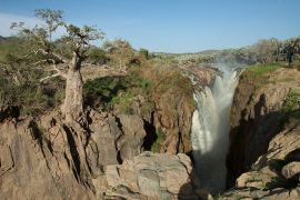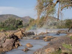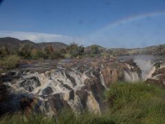 Ruacanafälle sind nicht wegen Wassermangels. Dann 40km zur Ruacana River Lodge. Sehr schön, Abendessen auf der Terrasse über dem Fluss. Dieses Jahr hat es bisher sehr wenig geregnet, Bilder zeigen den Wasserstand von vor drei Jahren – das ganze Camp steht 50cm unter Wasser, d.h. der Wasserstand ist ca. 1,8 m höher gewesen.