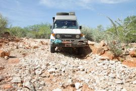 Die Fahrt über Tokamas den Fluss Gomatum entlang ist recht mühsam auf Wellblech oder Stein. Sesfontein – die Campsites sind in katastrophalem Zustand, meist von Einheimischen geführt, die Betreiber der Lodge im alten „German Fort“ wollen uns nicht auf Ihrem Gelände stehen lassen, obwohl kein sonstiger Touri da ist. Das ganze Dorf macht einen gammeligen Eindruck. Also weiter ins Gelände.