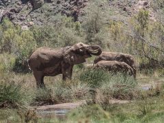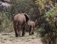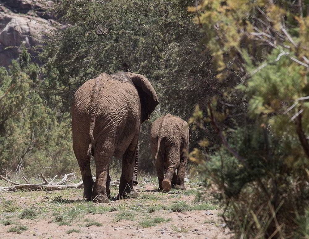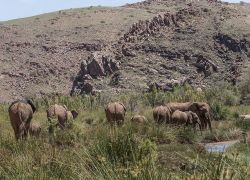 Tanken nach weiteren 125km in Palmwag. Veterinärkontrolle - Olaf hat schnell unsere angebrochene Wurst aus dem Kühlschrank entfernt, also kein Problem. Vor Twylfontein abgebogen in das nördl. der Straße liegende Huab Tal. Dort haben wir eine große Elefantenherde begleitet.