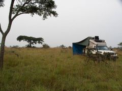 Reifenplatzer hinten. Kurz vor Zomoko guter Übernachtungsplatz auf einer Lichtung unweit an der Straße. War wohl mal eine Straßenbaustellen Einrichtung. (N00°32.182 E11°27.932) Es ist hier im Urwald äußerst schwierig einen Platz zu finden, man kommt praktisch nicht von der Straße runter. Ungestörter Nachtplatz mit lautstarken Urwald-geräuschen, wie man sich das im zentralafrikanischen Urwald vorstellt.