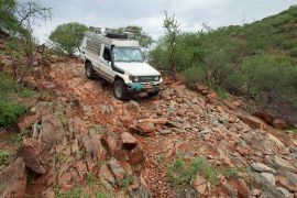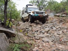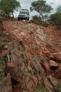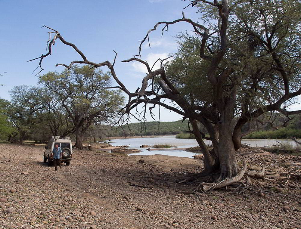 Wir wollen direkt am Kunene entlang die D370 zu den Epupa-Falls. Es sei sehr schwierig zu fahren, sagt man uns. Die vier Steigungen mit ca. 20%, großen Auswaschungen und großen Steinen haben es in sich. Manche vergleichen sie mit dem Van Zylst Pass. Lt. Angaben braucht man für die 95km zwischen 9 und 11 Stunden. Es sind insgesamt 7 Flussbetten zu queren und oft führt die Strecke direkt am Fluss entlang. Nach größeren Niederschlägen ist bereits an der ersten Querung (von Osten her) Schluss.