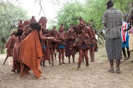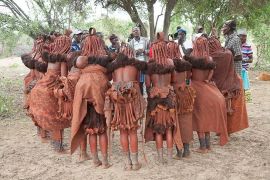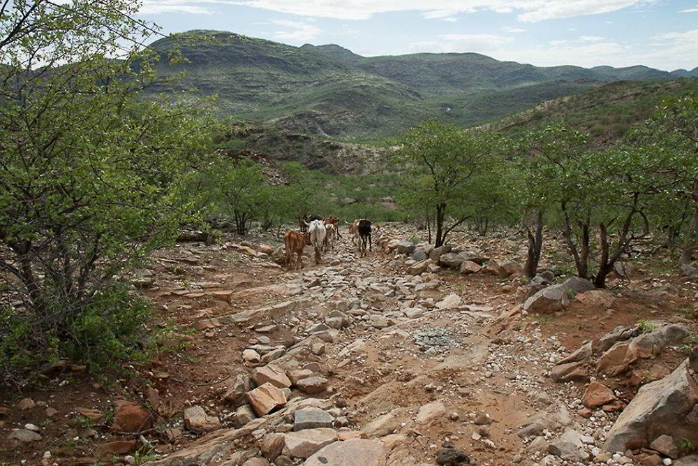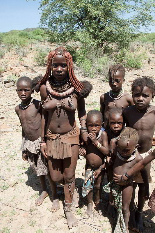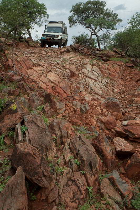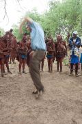 Irgendwie sind wir bei leichtem Regen bei Okauwe auf den Hauptpfad/Piste gekommen, auch die schon ganz ordentlich „off road“. Immer wieder fahren wir durch Ansiedlungen, und werden vorrangig von den Frauen am Auto begrüßt. In Otjitanda macht Olaf beim Tanz einer Gruppe Himba mit, diesmal sind sogar Männer dabei. Dann der erste Abstieg, hat schon was.