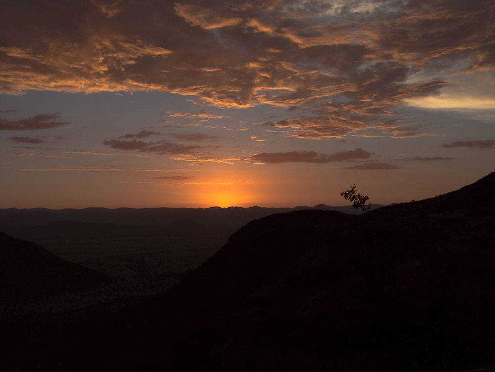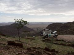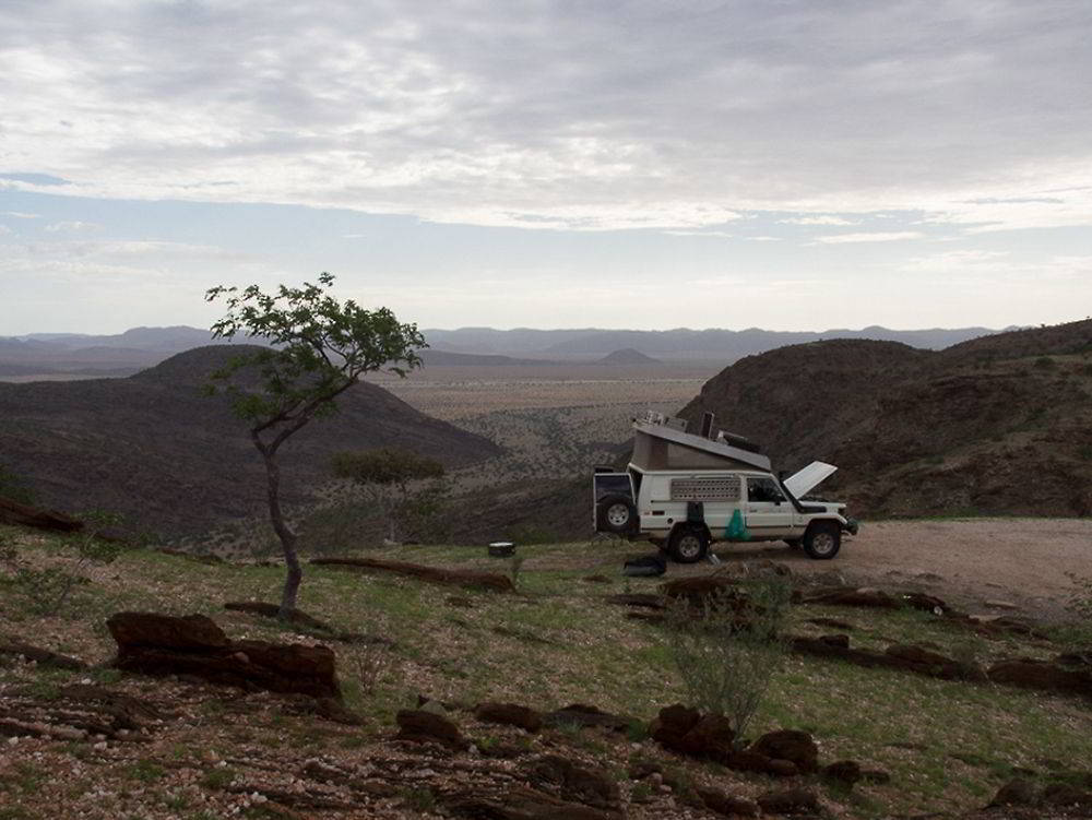Durch sehr gebirgiges auf und ab, z.T. hinter Kühen her kriechend, finden wir einen/den Übernachtungsplatz direkt am 300m Steilabfall zum Marienflusstal (17° 39.351/12°41.720) vor dem eigentlichen (?) Van Zyl’s Pass. Panoramaaussicht aus der ersten Reihe mit traumhaftem Sonnenuntergang.