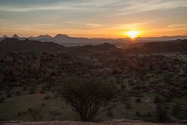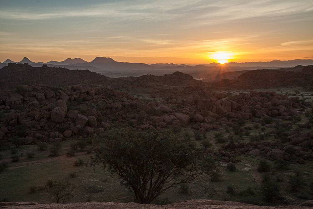 Twylfontein – Felsgravuren, Verbrannter Berg – naja, ist ein „Muss“, wenn man hier ist. Wir sind natürlich vom Ennedi letztes Jahr verwöhnt. Super Campplatz bei der Mowani Mountain Lodge. Dort fantastischer Sonnenuntergang und großartiges Essen.