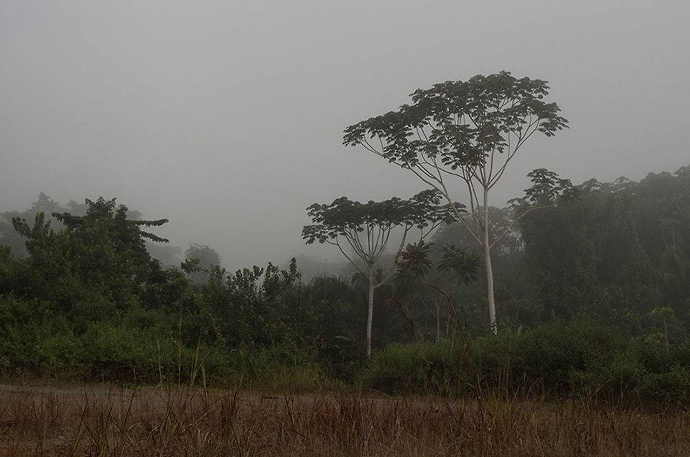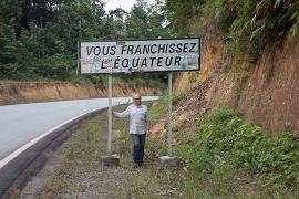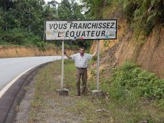 Am Morgen steigt Feuchtigkeit auf, gespenstische Beleuchtung durch den Nebel. Äquatorüberquerung an dem legendären Schild.