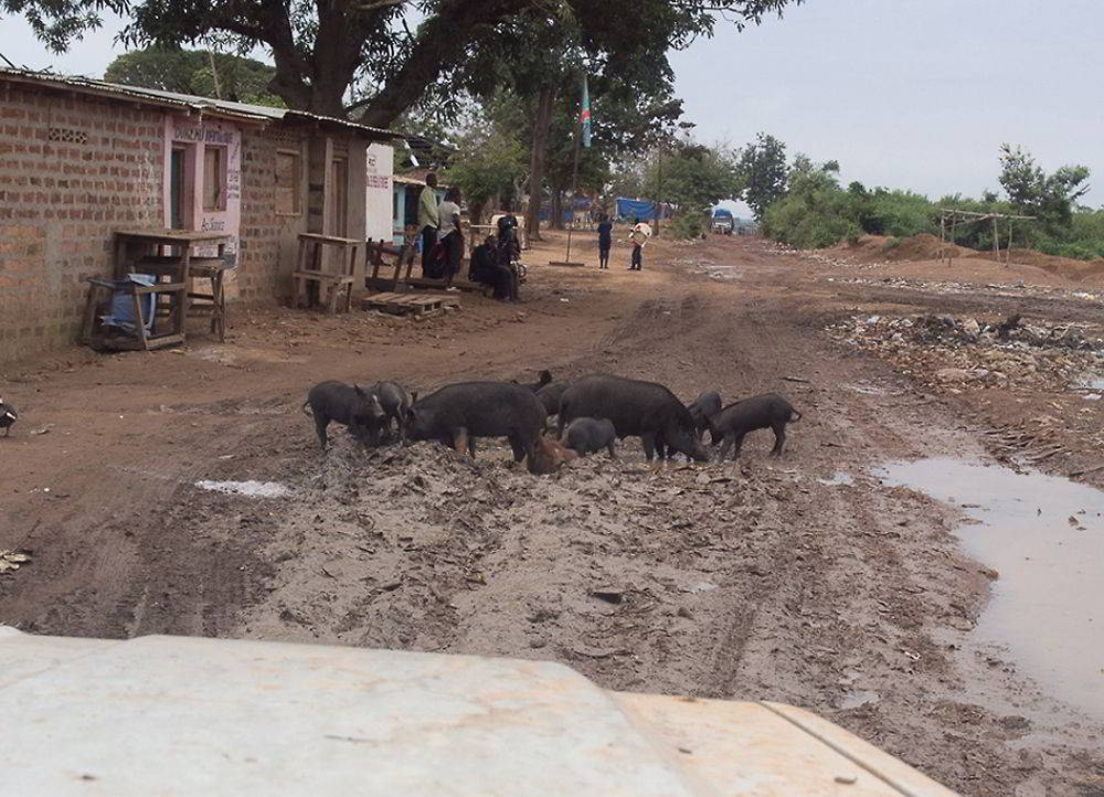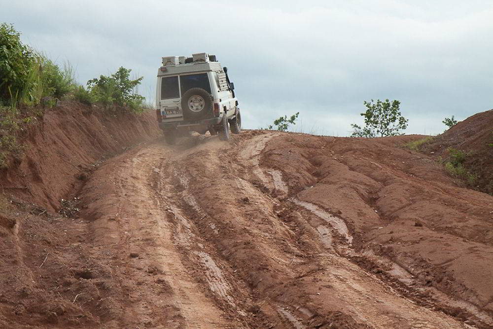 Dann üble Piste, bei Regen wahrscheinlich kaum fahrbar, weil schmieriger Lehm, z.T. steil bergauf bis zum „Demokratic Republic of the Kongo“ Grenzposten im nächsten Dorf (S04°52.700, O14° 22.507). Die Piste ist mit einer abgeschlossenen Schranke gesperrt. Zu Fuß zur Einreise, dann wird die Schranke aufgesperrt und es folgt eine intensive Fahrzeugkontrolle.