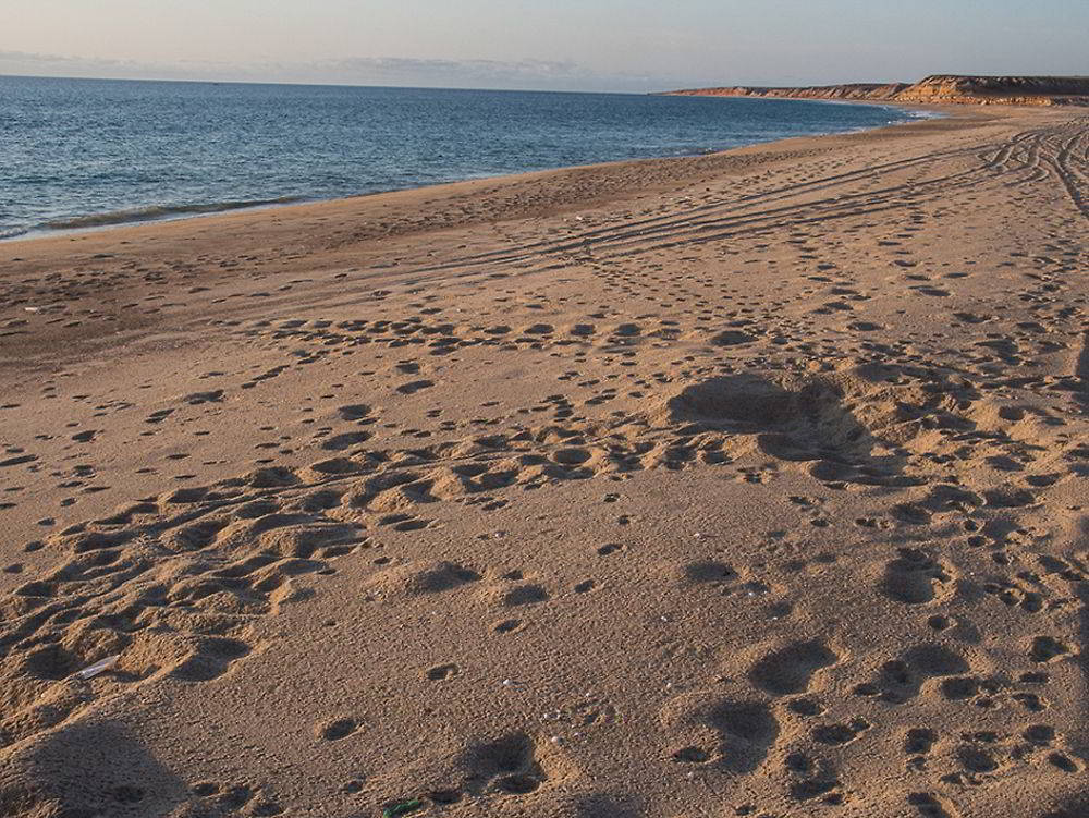 Hier ist ein Eiablageplatz von Meeresschildkröten wir sehen allerdings nur die Fußspuren und die Eiablagemulden. Dafür bei Nacht unendlich viele Krabben, vor allem an einem toten Fisch.