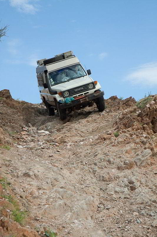 Der letzte Rest hat es wirklich in sich. Der Van Zylst Pass hat nun nochmals drei Steilabfahrten und lässt selbst bei erfahrenen Offroadern den Adrenalinpegel steigen. Ich schätze ca. 25-30% auf und ab und das jeweils über ca. 300m Länge. Bilder sagen mehr als Worte. Am Ende des Passes verewigen sich viele „Bezwinger“ auf Steinplatten, es ist nachvollziehbar.