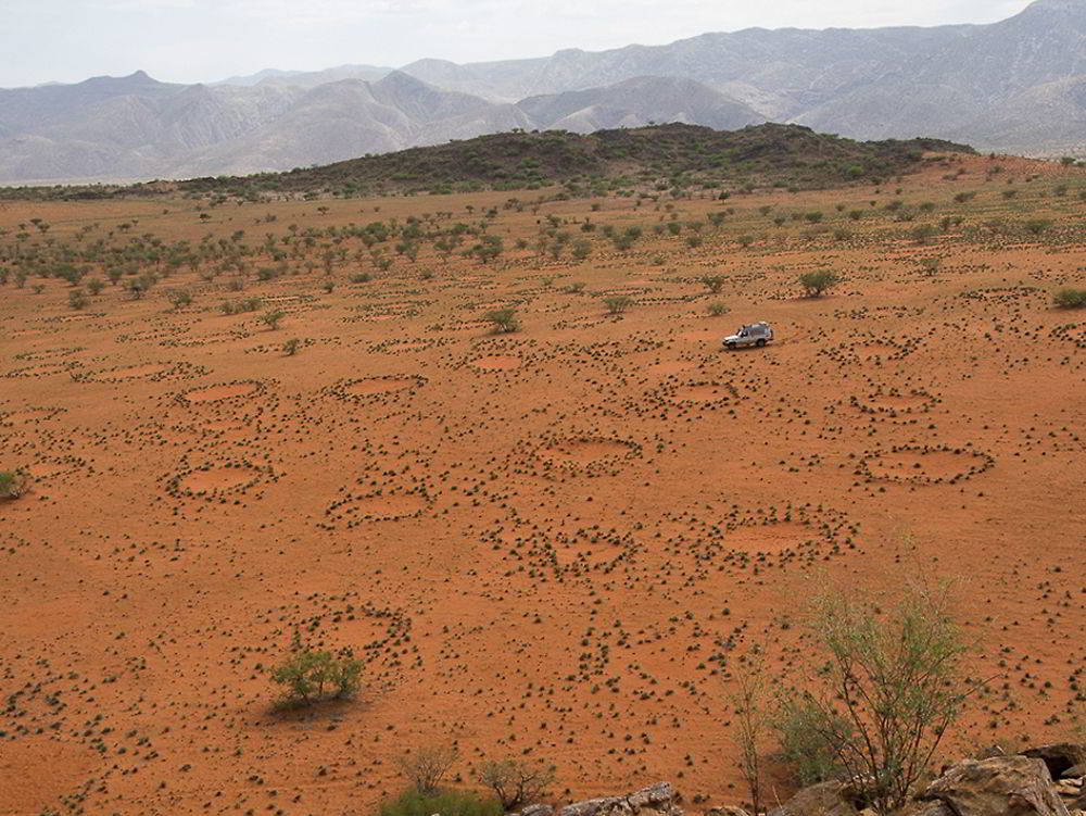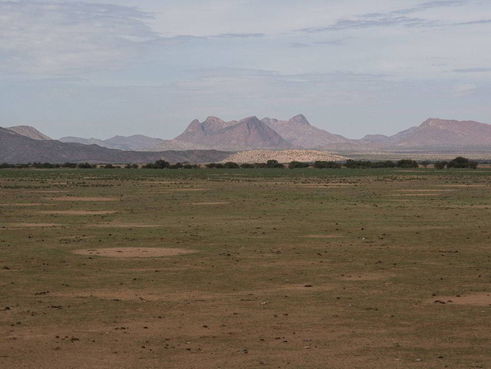 Sog. Feenkreise im Marienflusstal. Diese entstehen durch Sandtermiten, welche die Wurzeln der Gräser abfressen. Sieht toll aus. Eine andere Version ist, dass das Gras selbst auf Grund der wenigen Regenfälle so wächst. Wir sehen unsere ersten Antilopen, und Strauße.