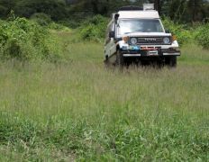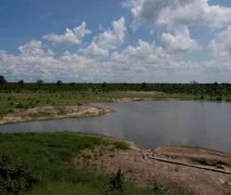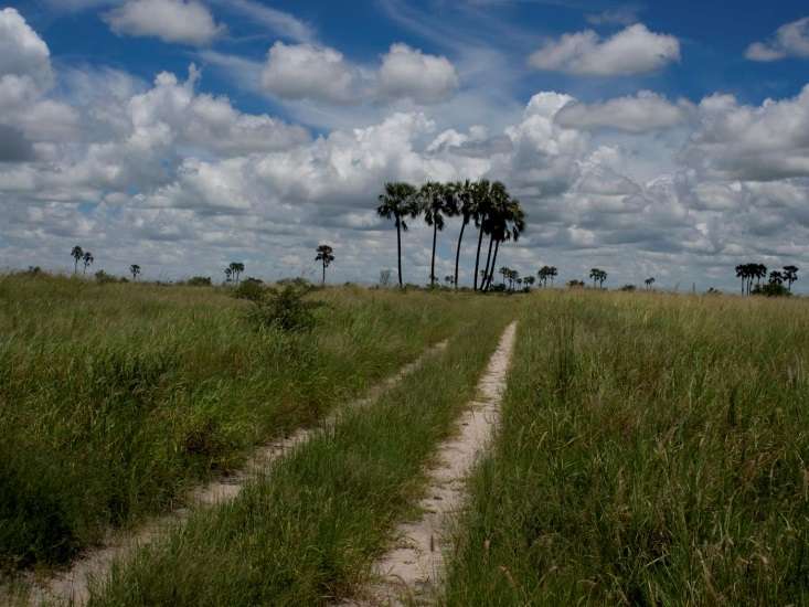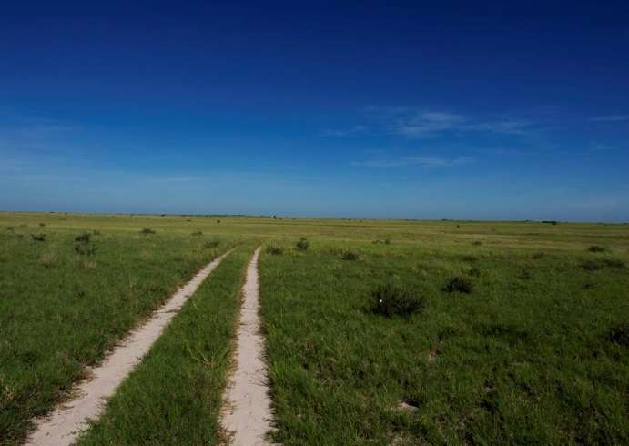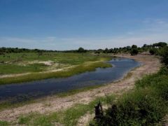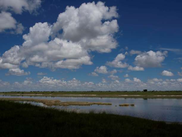 Fahrt durch Grasland nach Khumaga um dort den Boteti zu überqueren. Geht nicht, da für den Ponton zu wenig Wasser fließt und für das queren mit dem Auto zu viel.