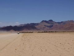 Wir stehen mitten in der Wüste, die Temperaturen steigen wieder bis 37 Grad und es ist trocken. Es sind im Schnitt 10 Grad mehr als in Simbabwe und Botswana. Ein schöner Sonnenuntergang, ein toller Sternenhimmel mit der Milchstraße, das Kreutz des Südens sowie ein beeindruckender Mondaufgang beenden den Tag.