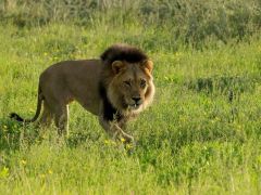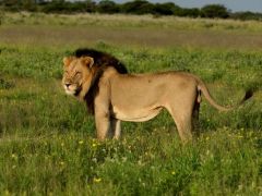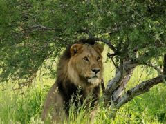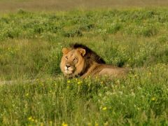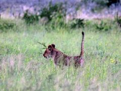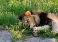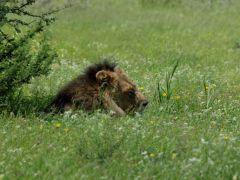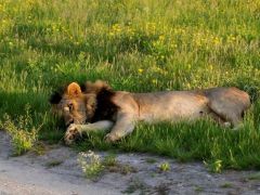Abends nochmal zum Löwen, kaum zu glauben, er liegt ca. 30m weiter als am Morgen und wir haben ihn mittags nicht gesehen. Er hebt ab und zu den Kopf und lässt sich wieder fallen. Das geht lange so. Dann steht er auf, läuft dicht am Auto vorbei und lässt sich an der Piste wieder fallen. Wir fahren zu ihm, halten ca. 3m (Pistenbreite) von ihm entfernt, aber ihn scheint das gar nicht zu interessieren. 500m weiter sehen wir dann das wohl zugehörige Weibchen mit zwei Jungen.