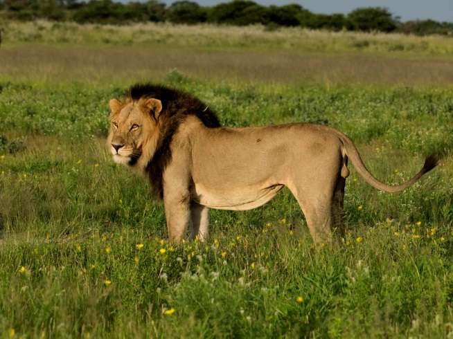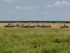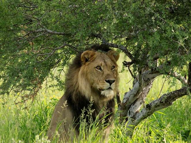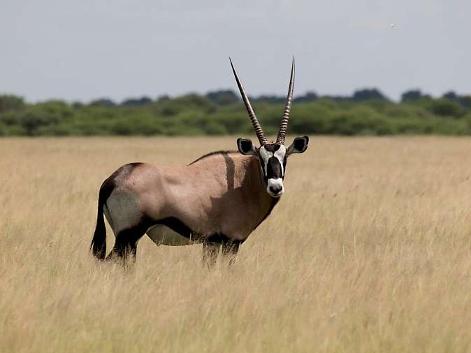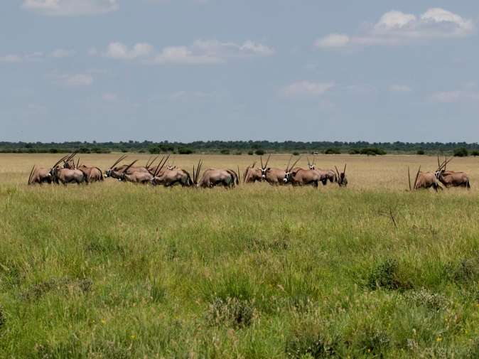 Wir fahren schon morgens zum Letiahau camp. Oryxe überall. Rundfahrt zur Phokoje pan. Unterwegs sehen wir einen Löwenmann unter einem Busch, nahe dabei 28 Giraffen.
