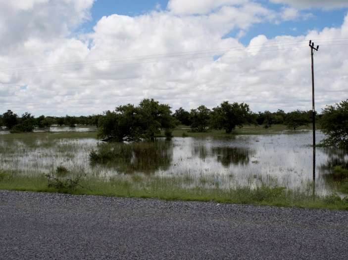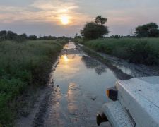 Die 50 km bis zum Parkbeginn des CKGR ist eine Katastrophe. Große Wasserlöcher mit Wasser dazwischen, 2 Stunden Fahrt. Es ist fast dunkel als wir am Haupttor – Matswere Gate ankommen. Ein Deutscher der mit Familie im LKW Womo unterwegs ist, erzählt uns dann, dass er 6 Tage im Schlamm saß, die Familie wurde zwischenzeitlich nach Rakops gefahren. Hört sich nicht gut an.
