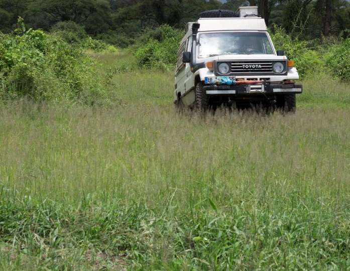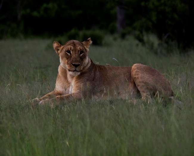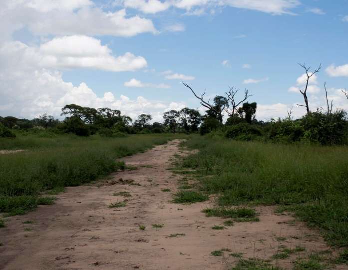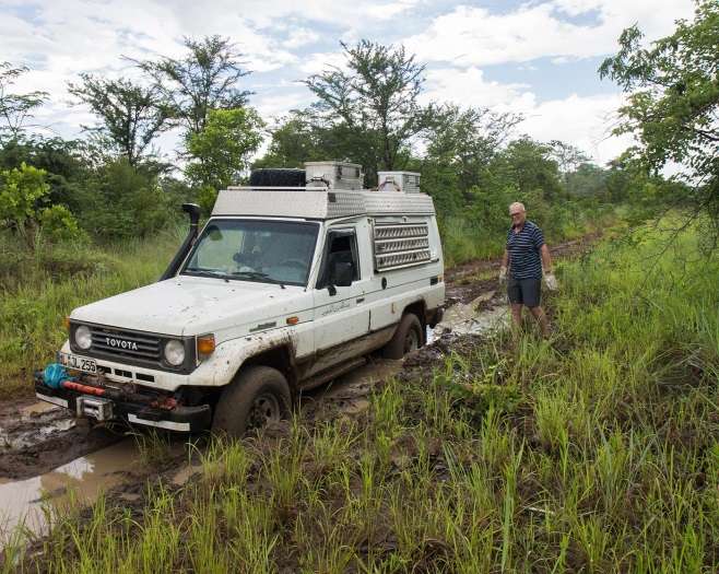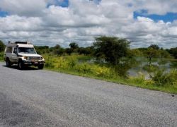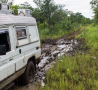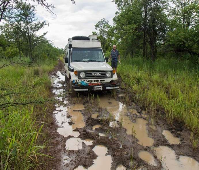 Zurück zu fahren hat bei einbrechender Dunkelheit keinen Sinn. Auf der einzigen trockenen Sandstelle wollen wir übernachten. Dann allerdings ein ziemlicher Schock – vor uns brüllen Löwen, später hinter uns, wir stehen wohl auf deren trockenem Wechsel, die haben vermutlich auch keine Lust durch die Großpfützen zu laufen.