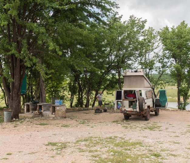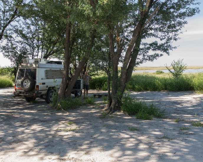 Auf der Fahrt nach Kennedy 1 halten wir am Guvalala pan und finden es schön, es ist ein völlig frei in der Natur angelegtes Camp mit Hochstand.