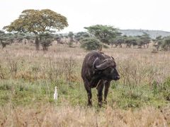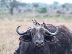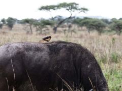 Auf der Auf der Weiterfahrt nach Moro 3 sehen wir große Zebra- und Büffelherden. Einige der Büffel haben verschiedene „Madenhacker“ auf dem Rücken.