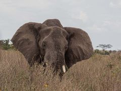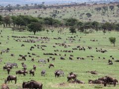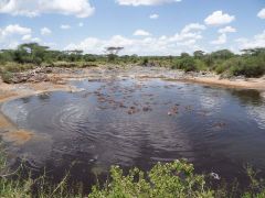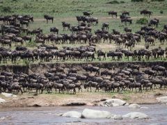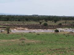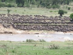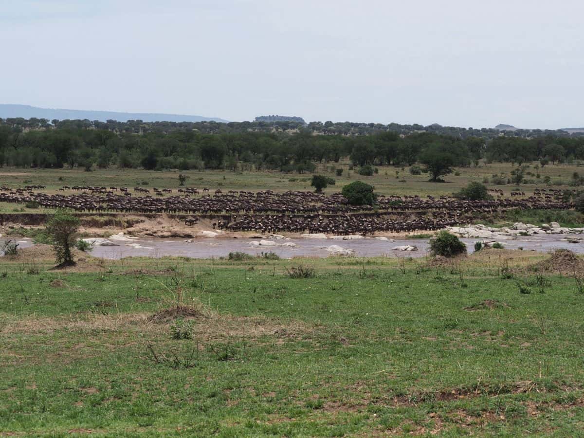 Unser Hauptziel heute ist der „Mara“ Fluss. Viele Tiere sind unterwegs, vor allem Gnus und Zebras. Am Mara sind auf der anderen Seite, d,h. in Kenia, sehr viele Gnus versammelt, die alle über den Fluss kommen wollen, da hier in Tansania die Weideflächen wieder grün werden.