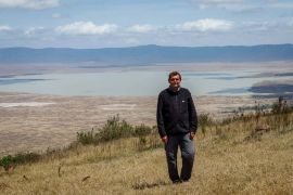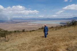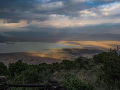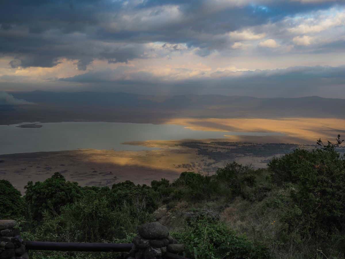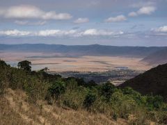 Aufbruch zum „Ngorogoro Krater“ auf katastrophaler Piste. Toller Blick in den Krater Kessel mit See aus 2350m Höhe hinab auf 1750m. Wir fahren nicht in den Krater hinunter.