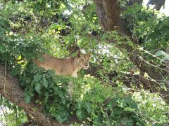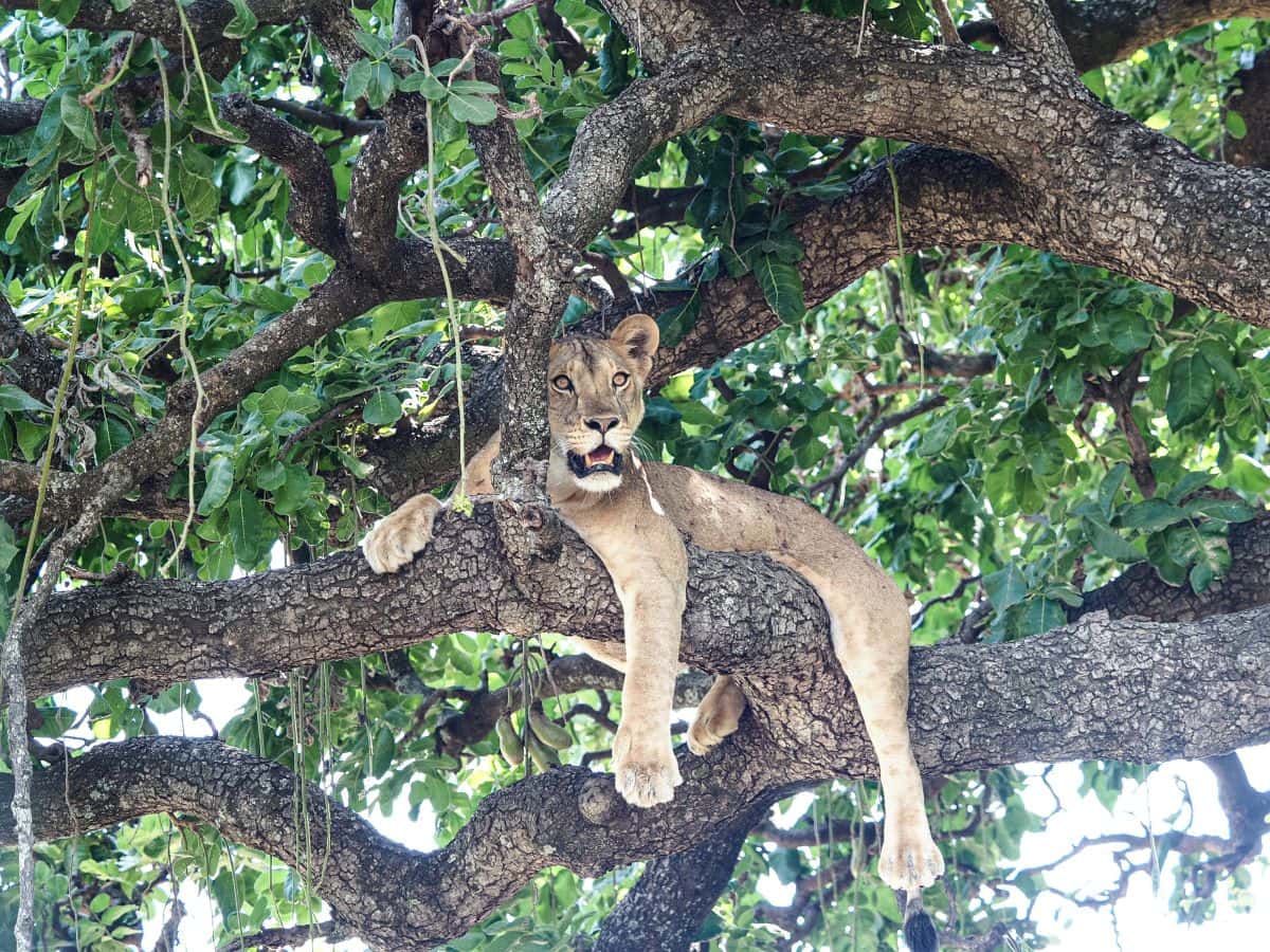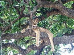 Wir sind über 100 km im „Manyara N.P.“ gefahren. Dort sahen wir dann eine Löwin auf einem Baumast liegen, der über die Piste hinweg hing.