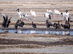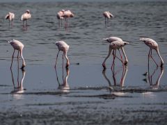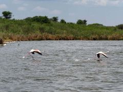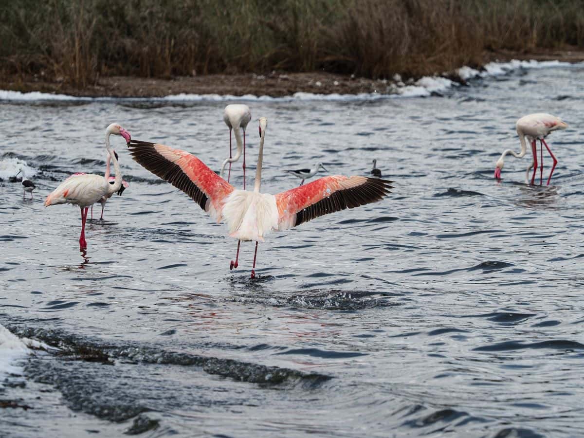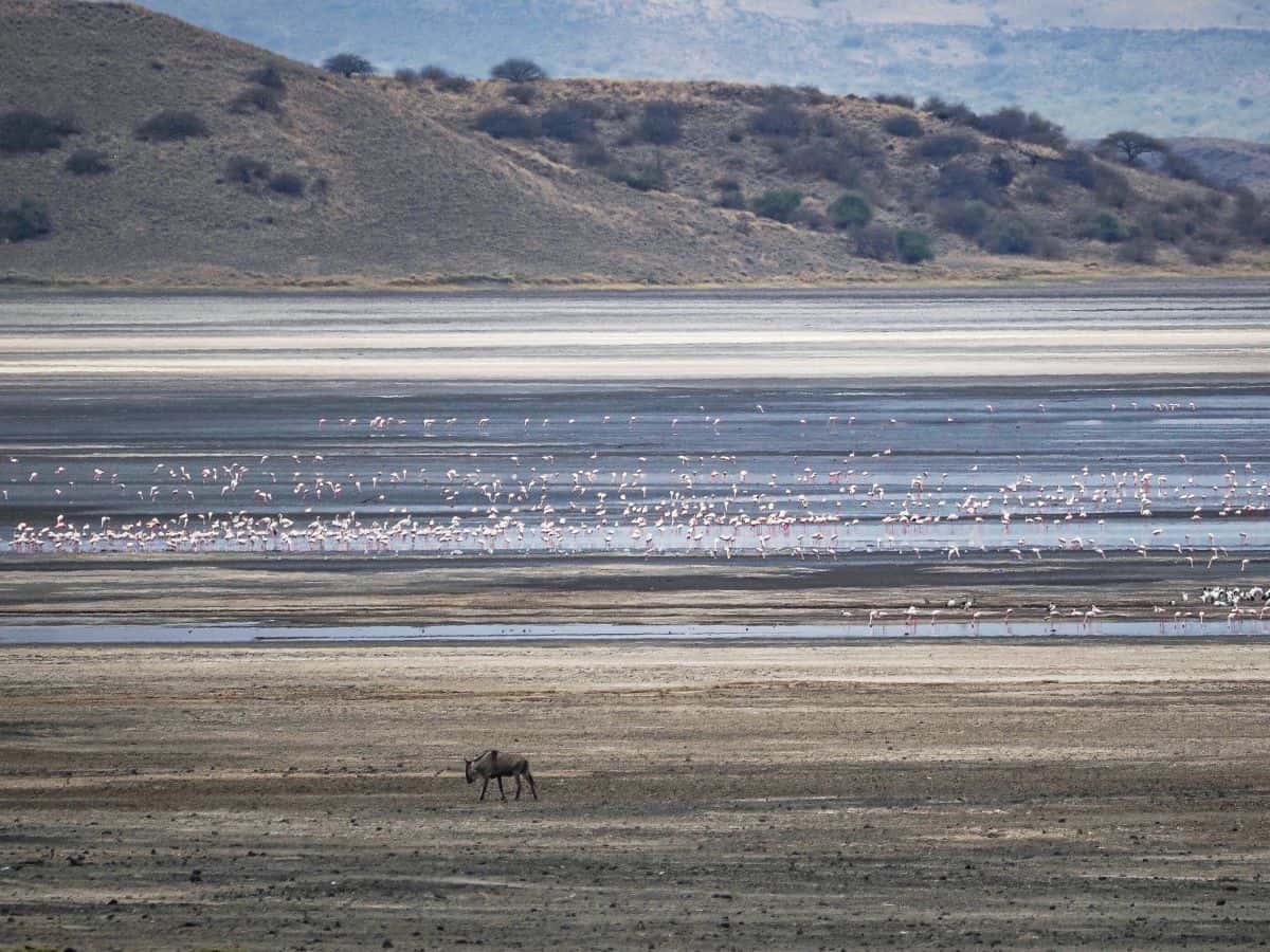 Der See war wohl vor einiger Zeit voller als jetzt, sodass es jetzt eine breite schlammige Uferzone gibt. So sehen wir die Flamingos nur aus der Ferne, da wir nicht nahe genug an den See kommen.