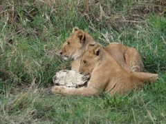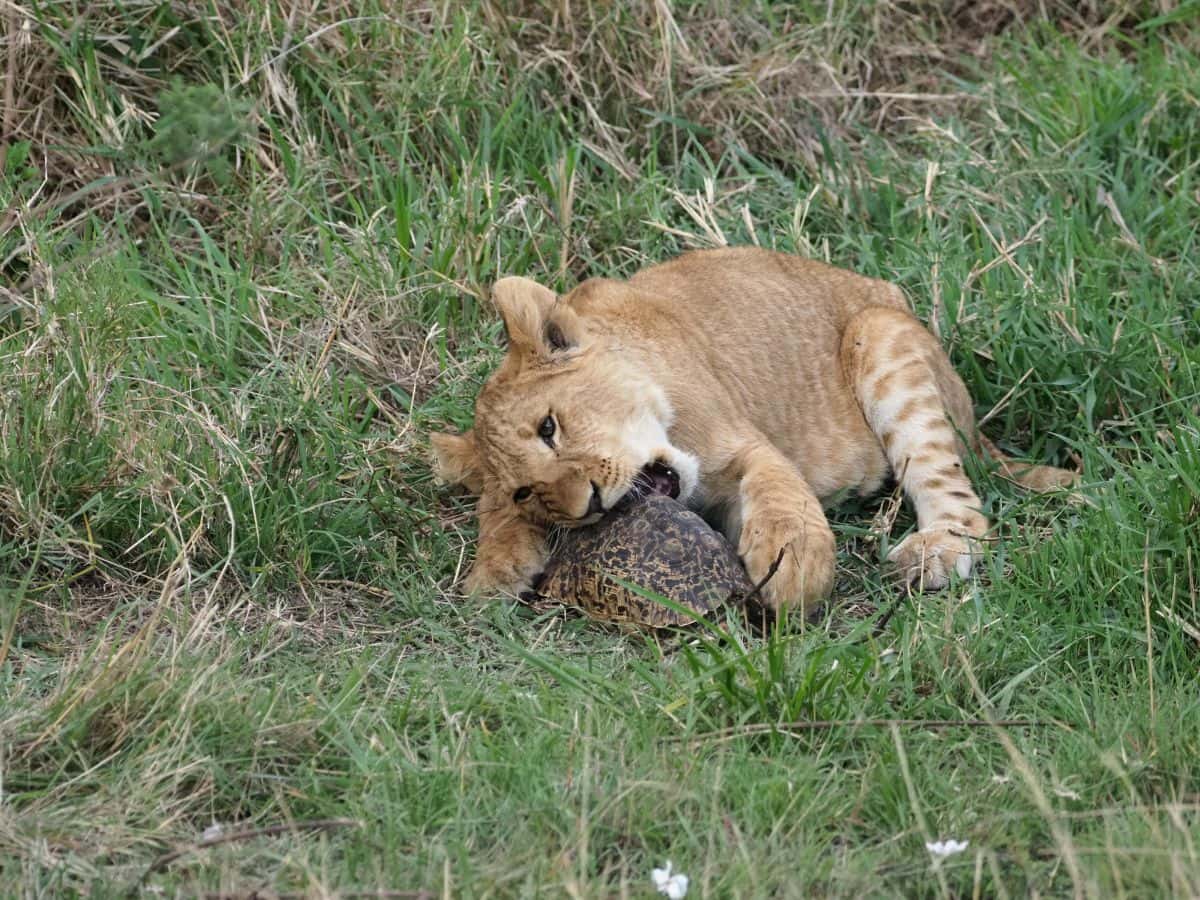 Auf der Rückfahrt entzücken uns zwei Löwenjunge, die versuchen, eine Schildkröte zu knacken. Es gelingt ihnen nicht.
