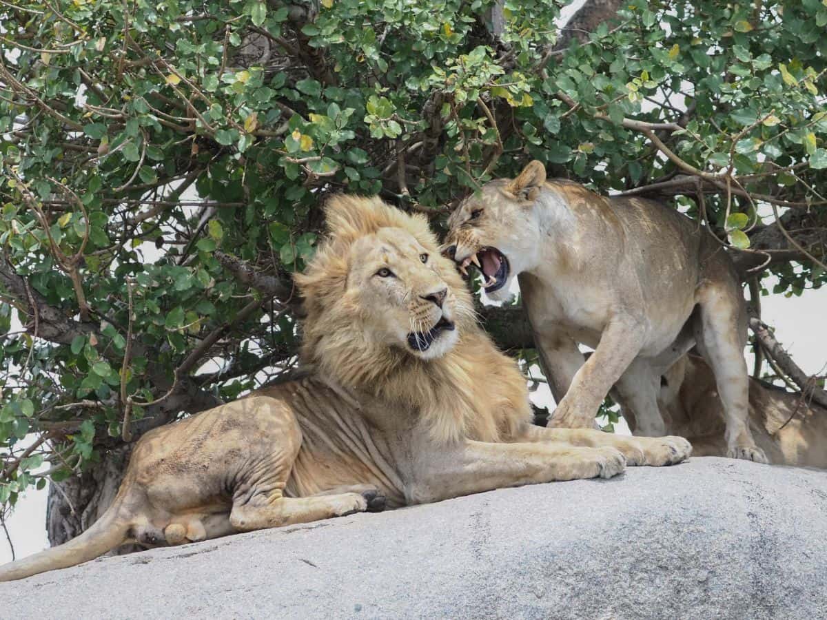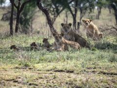 Mittags dann einen Pascha mit drei Löwinnen auf einem Felsblock. Die lassen sich durch die vielen Touri-Autos nicht im Geringsten stören, sondern verschwinden dann zwischen den Autos hindurch im Gelände.