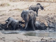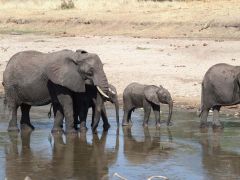 So stellt man sich Safari in Afrika vor: Blick von oben auf einen Fluss, viele Tiere beim Saufen, vor allem Elefanten. Blauer Himmel und 40 Grad in der Sonne bei einem Drink. Beste Filmkulisse.
