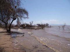 Den vielen Baobabs, die den Hang entlang stehen (Olaf steht unter einem solchen Riesen), hat der viele Regen in den letzten zwei Jahren nicht geschadet. Dagegen stehen die Bäume am früheren Seeufer jetzt im Wasser und sind kaputt.