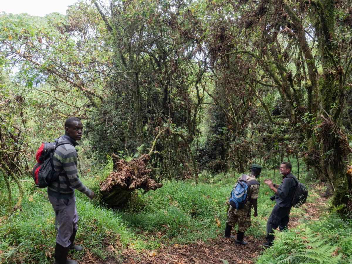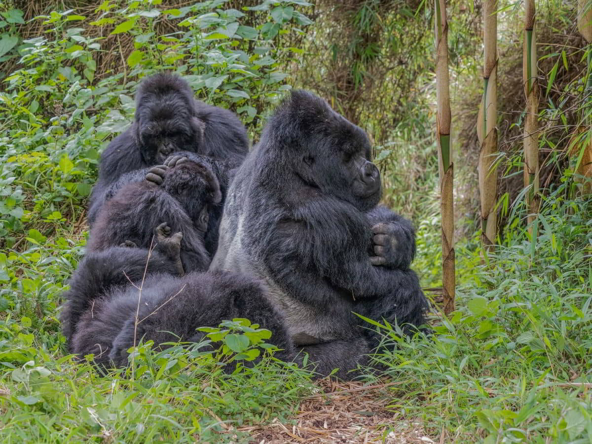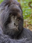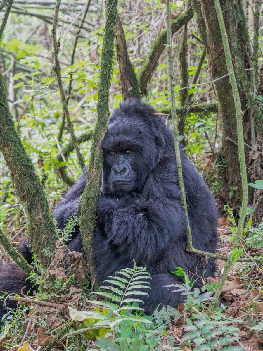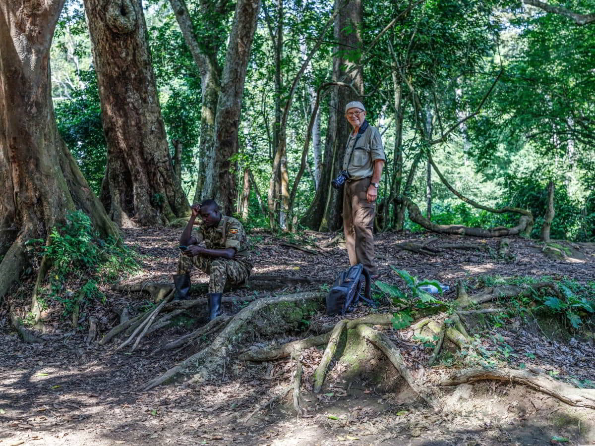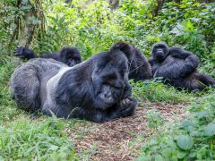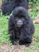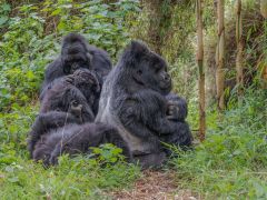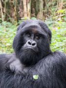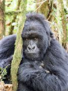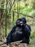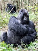 Nach 2,5 Stunden und ca. 300 Höhenmetern durch den Urwald, was mich an den Rand meiner körperlichen Leistungsfähigkeiten bringt, stehen wir plötzlich mitten in der Gorillafamilie. Es ist ein unbeschreibliches Gefühl diesen riesigen Tieren auf fünf Metern Entfernung gegenüber zu stehen. Wir sind bei der Nyakagezi Gruppe mit zwei Silverbacks, drei erwachsenen Weibchen, sowie zwei Halbstarken und zwei Babys. Die lassen sich von uns überhaupt nicht beim Frühstück stören, eines der Babys ist sogar richtig neugierig. Nach einer Stunde müssen wir die Familie wieder verlassen.