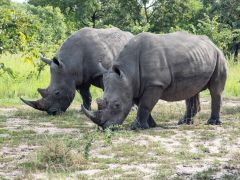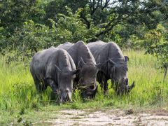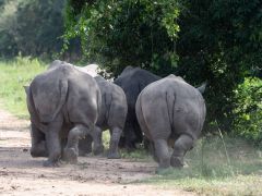 ... zur Ziwa Rhino Sanctuary, einem recht großen Gelände, auf dem verletzte oder junge Tiere aufgezogen werden. Für mich sind es auf unseren ganzen 80000 Kilometern Strecke die ersten Rhinos, die ich sehe. Wir laufen dann rund um diese großen Tiere herum, das scheint die nicht zu stören. Abends werden um die Restaurantterrasse, sowie unser Campplatz mit sehr massiven Barrieren verrammelt. Wir denken uns, das ist Show.