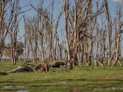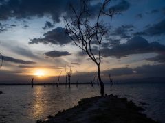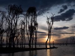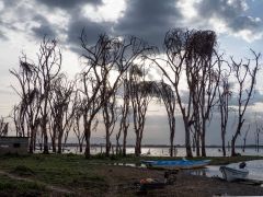 Durch Nakuru zum Lake Naivasha. Auch dort sind am ganzen Ufer entlang die Bäume kaputt. Toller Sonnenuntergang.