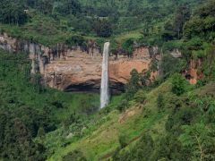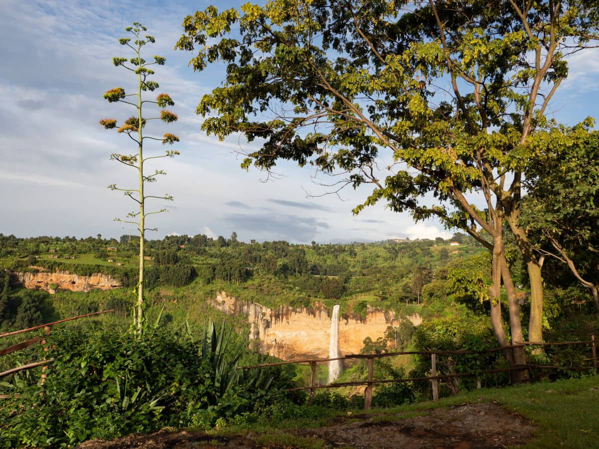 Mittags dann Fahrt zu den Sipi Falls am Westrand des Mount Elgon. Toller Blick vom Campplatz, nach Westen ca. 150 Meter Steilabfall, nach Norden der 100 Meter hohe Wasserfall.