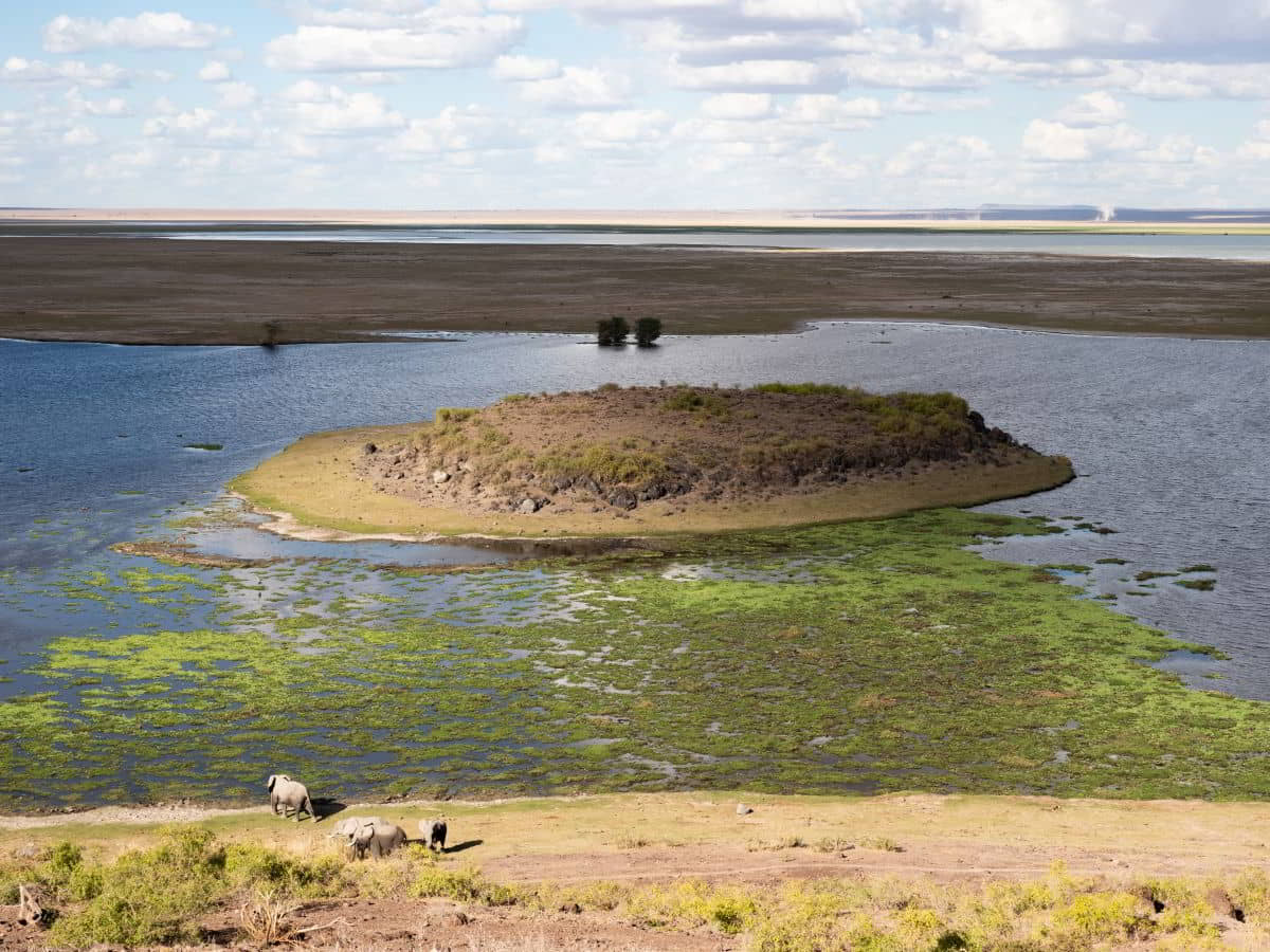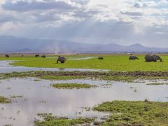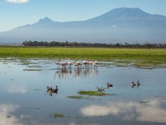 Inzwischen gibt es einen vom Norden kommend westlichen und südlichen Ring um Nairobi, so dass wir mit einer knappen Stunde Fahrzeit um Nairobi herum sind. Als Abschluss der Reise besuchen wir noch den Amboseli Nationalpark. Es ist sehr trocken, So haben sich die Elefanten beispielsweise angewöhnt, in den Tümpeln zu stehen und das Grünzeug zu fressen, da auch hier die Bäume kaputt sind.