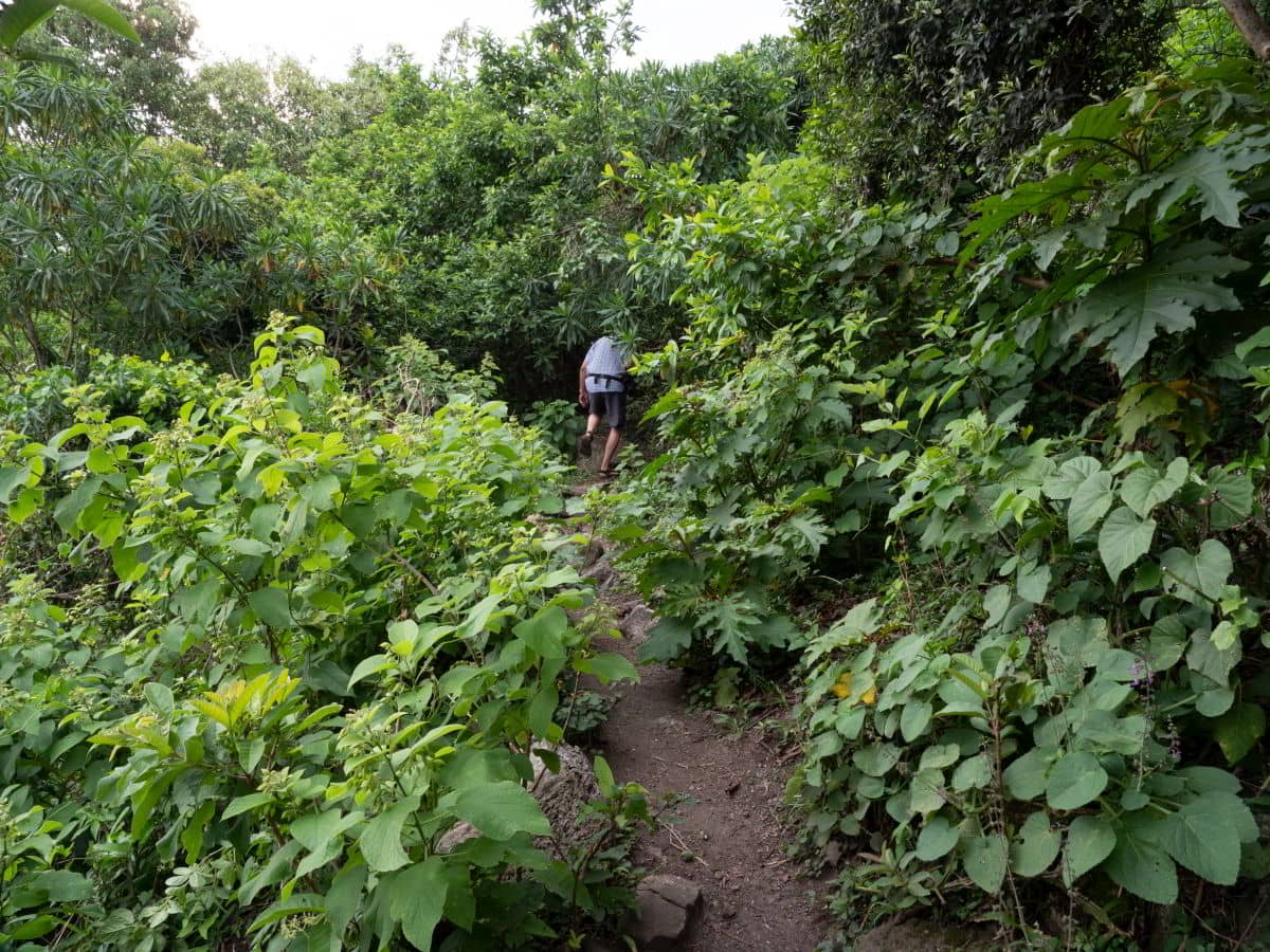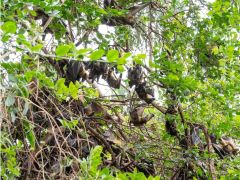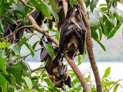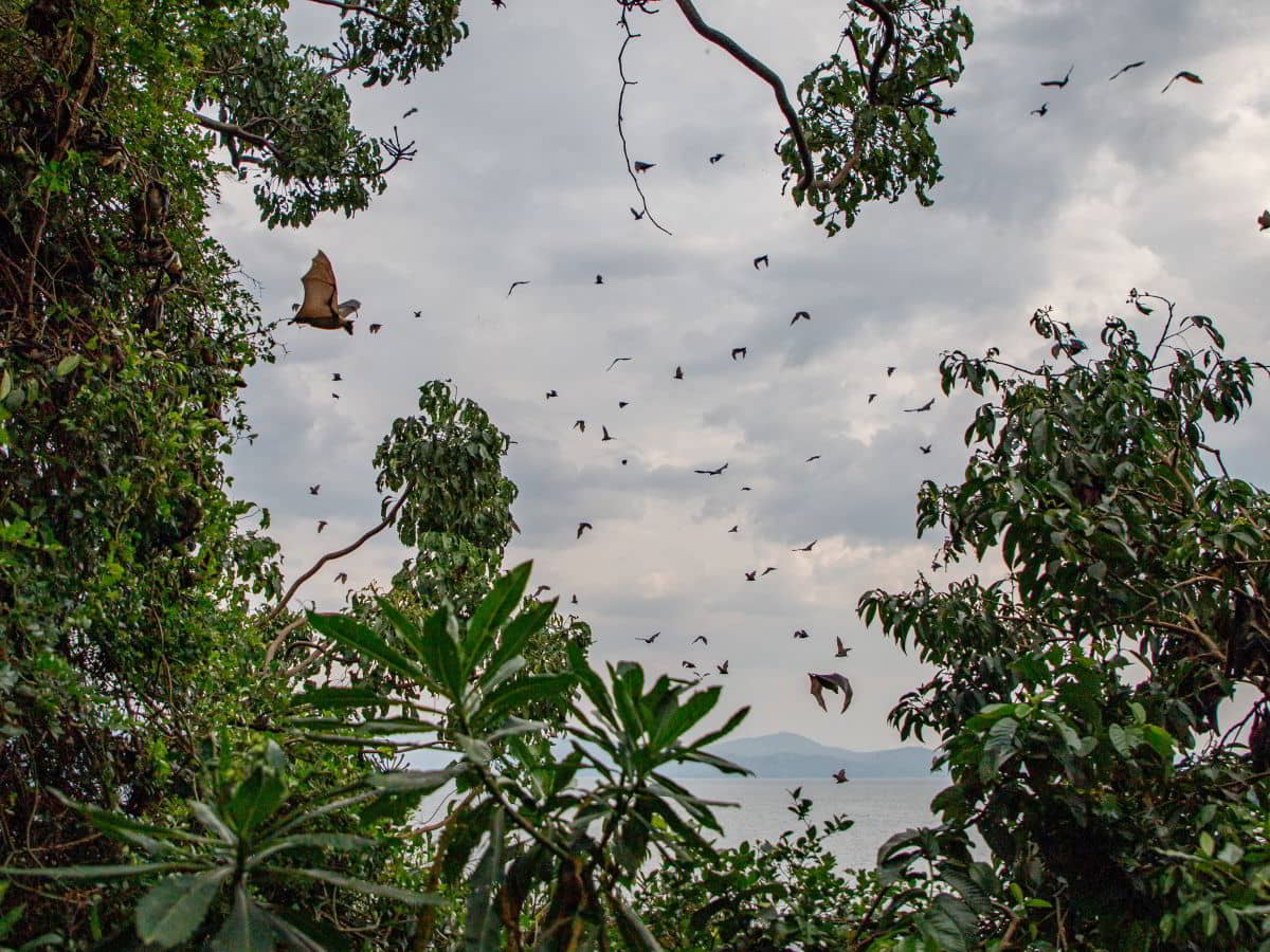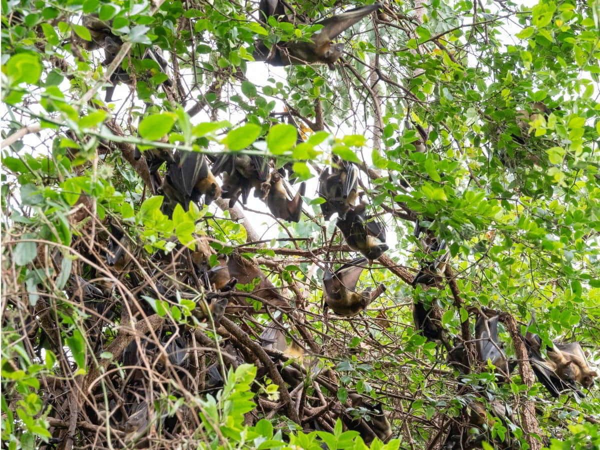 Bremslichter repariert, nur Dreck im Kontaktgeber-Bremspedal. Mittags dann mit dem Boot durch die Inseln zum Napoleons Hut. Durch eine größere Ansammlung von Flughunden geht der Weg Richtung Gipfel der Insel.