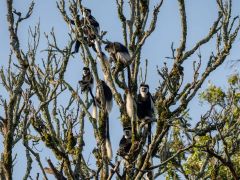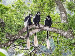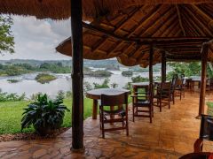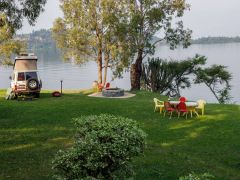Schöne Landschaft mit schönem Campplatz am Lake Nkuruba, an dem wir dann auch übernachten. Begrüßt werden wir von drei Colobusi Affen mit ihren langen Schwänzen mit großer weiser Quaste, auf einem Ast sitzend.