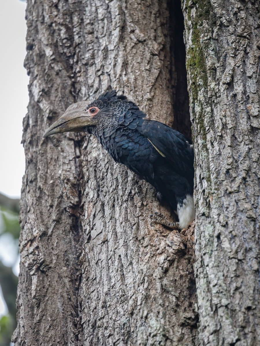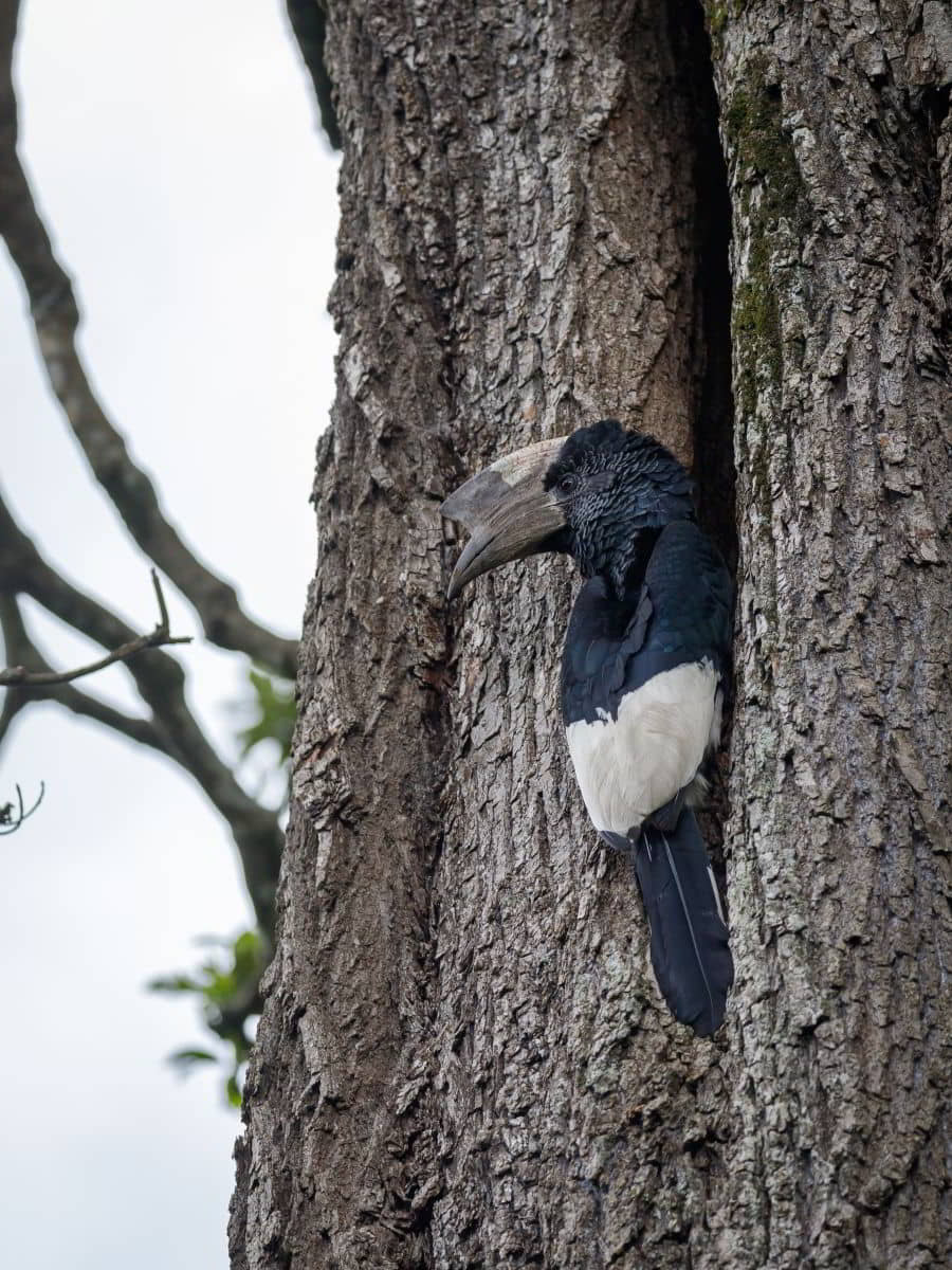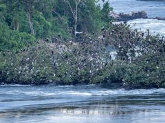 Urlaub, am Mittag Regen. Zum Abendessen gönnen wir uns ein (tolles) Menü mit einem Blick auf hunderte auf dem großen Busch übernachtenden Vögeln.
